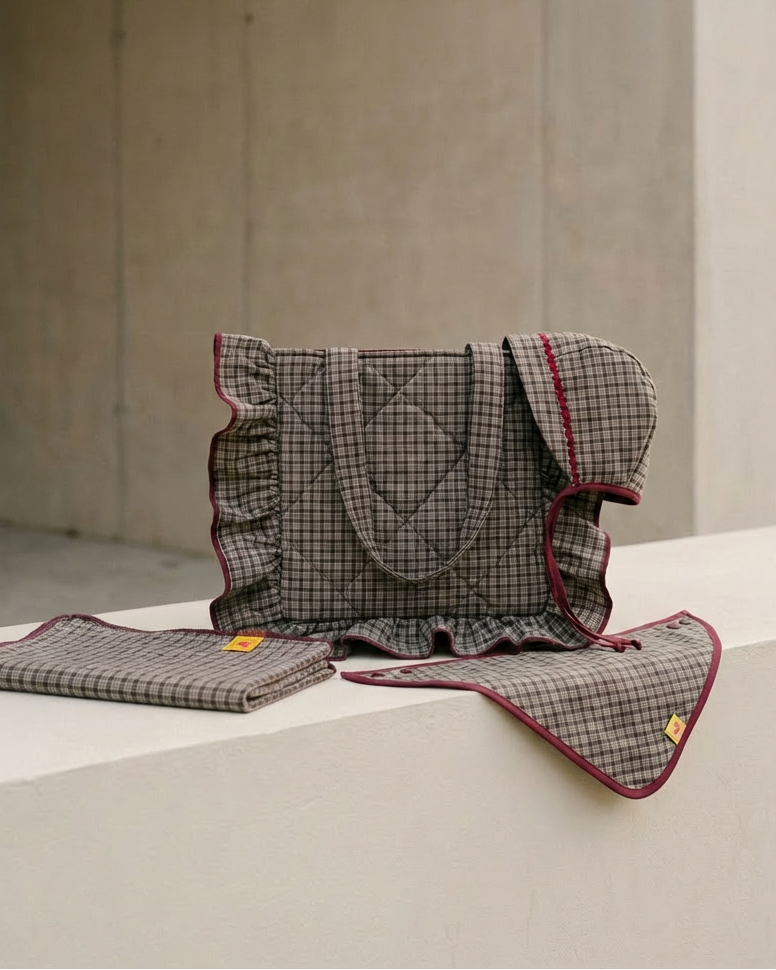 Este pack reúne cuatro piezas a conjunto —bolso de mamá, bonnet de bebé, bandana babero y muselina— en tejidos suaves y coordinados, para esos días en los que salir juntas ya es suficiente plan.