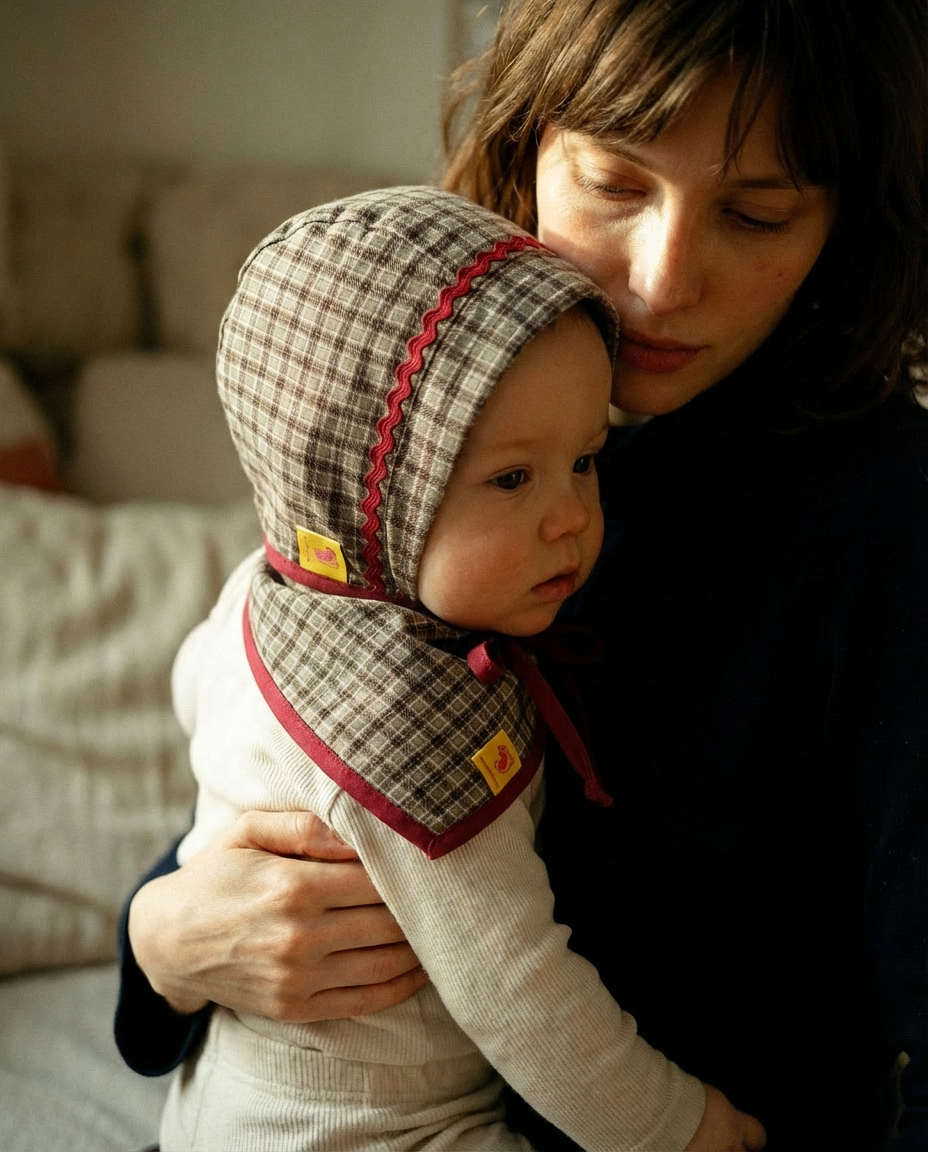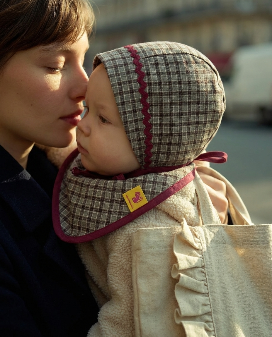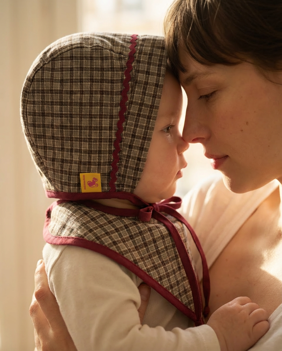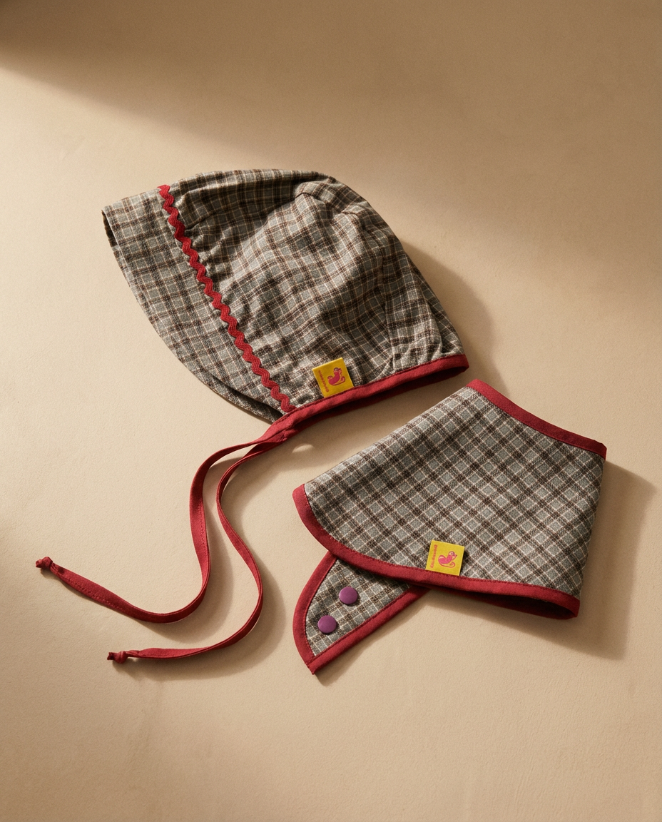 El bonnet y el babero bandana dialogan en el mismo tejido de cuadros caqui, con ribetes granate que aportan carácter y calma.