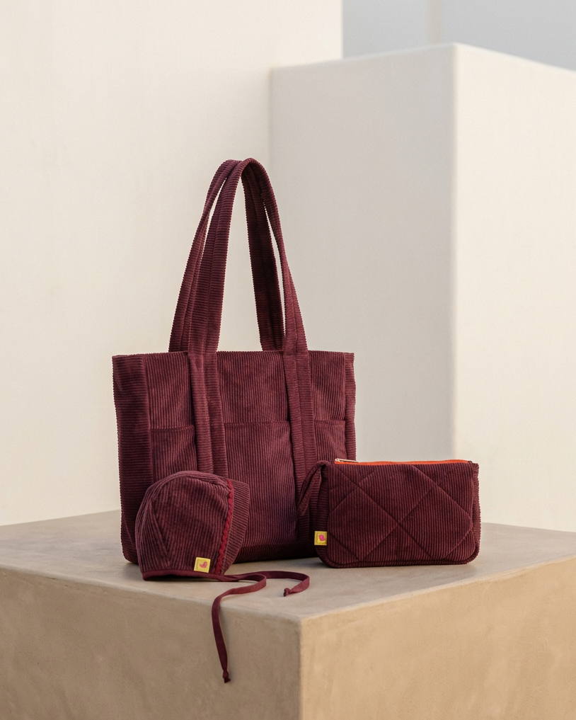 Este pack reúne tres piezas en pana granate —bolso, neceser y bonnet— pensadas para acompañar los días de otoño e invierno.