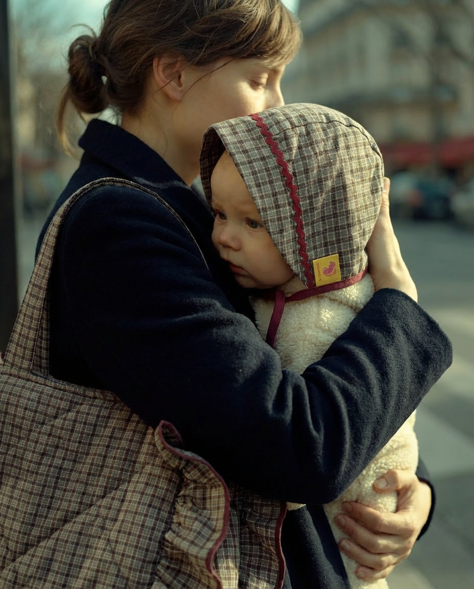 El bonnet, ligero y delicado, abriga con suavidad y enmarca la carita del bebé sin molestar, acompañando desde los primeros meses.