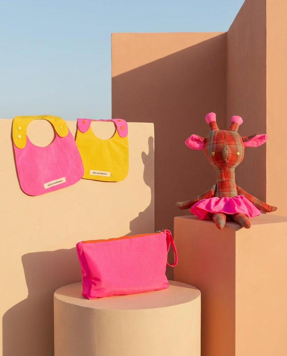– 2 baberos reversibles en colores vitamina. – 1 babero fucsia x fucsia y 1 babero amarillo x amarillo con clicks para poder intercambiar las partes de arriba. Medidas: 29cm x 22,5cm