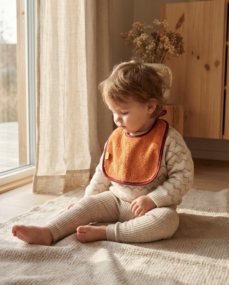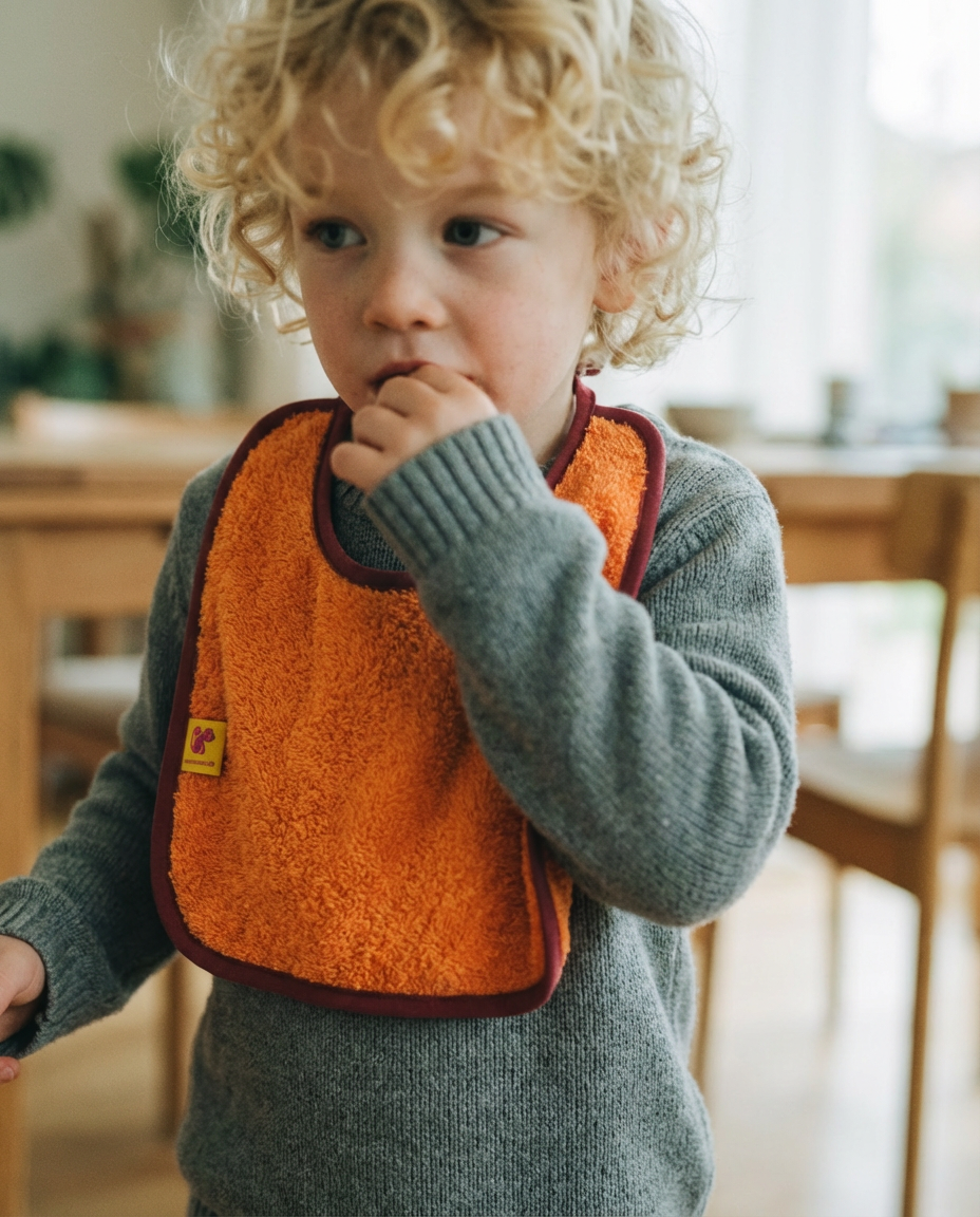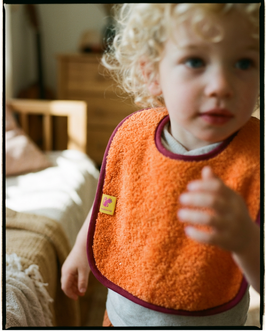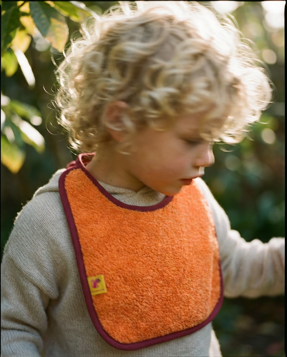 Nuestro babero de rizo naranja es uno de esos detalles que acompañan la infancia con una ternura tranquila. Por un lado, su rizo suave y absorbente recoge derrames y primeras aventuras llenas de migas; por el otro, un muselina color malva empolvado que aporta ligereza, comodidad y resistencia para el día a día.