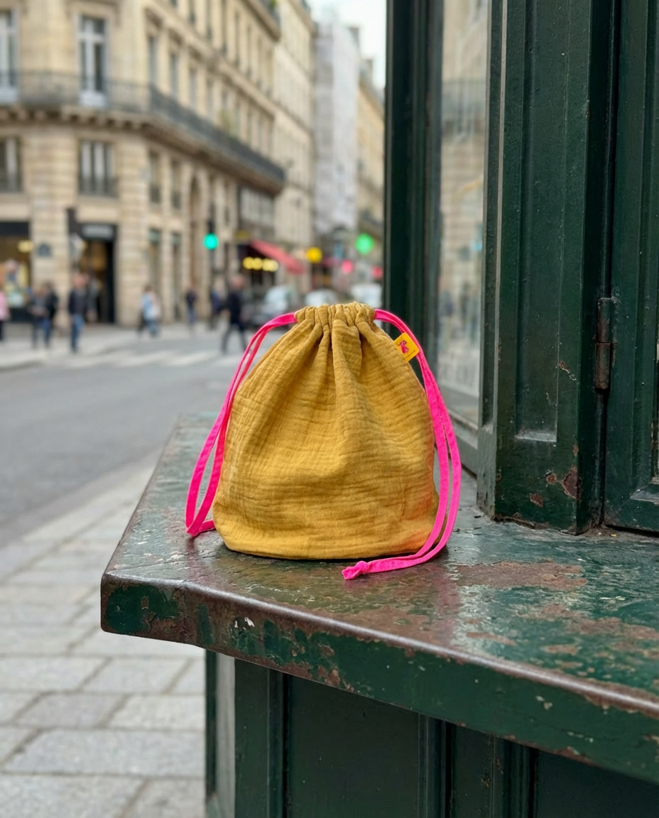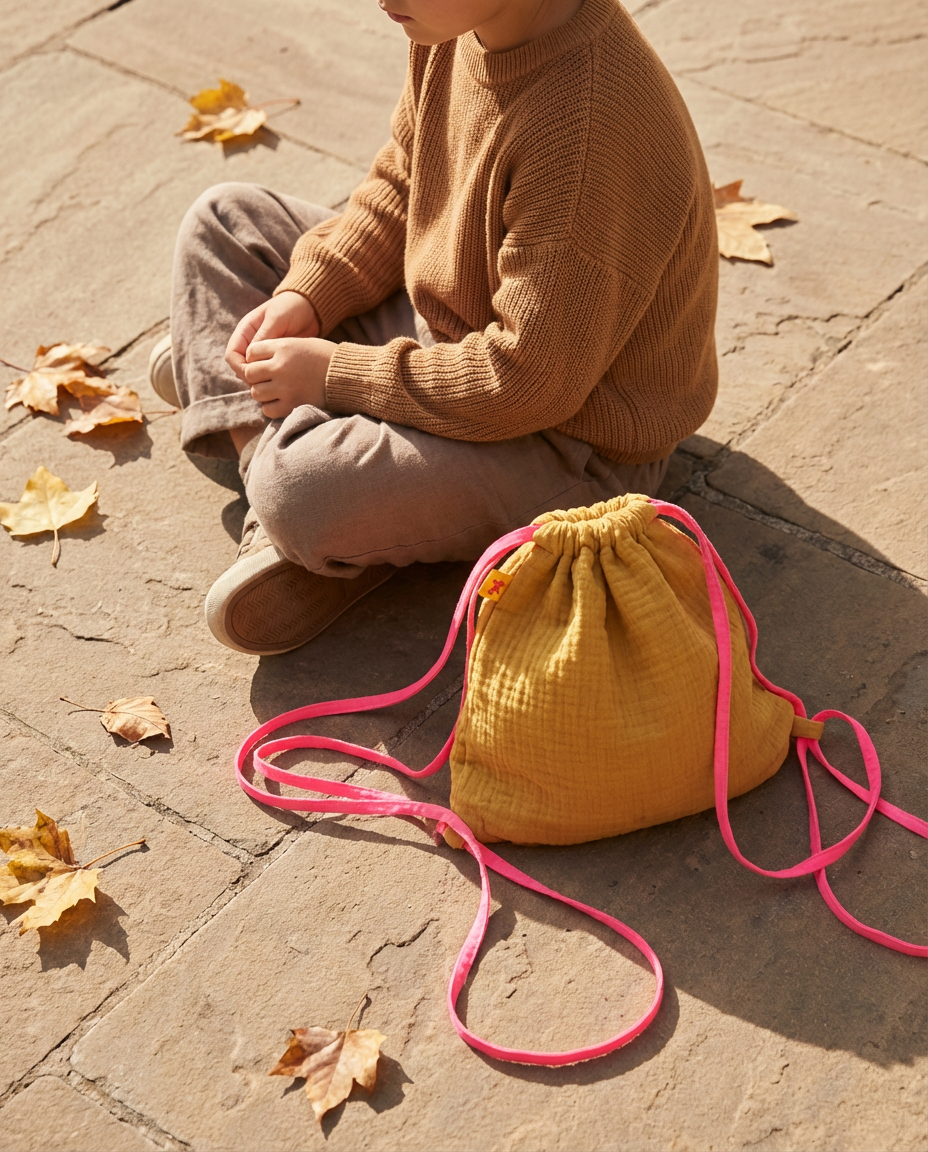Confeccionada en muselina 100% algodón, suave, ligera y con ese gesto arrugadito que la hace tan especial. El color amarillo curry ilumina cualquier plan, y los cordones rosa neón ponen el toque juguetón que define a Macadamia Kids.