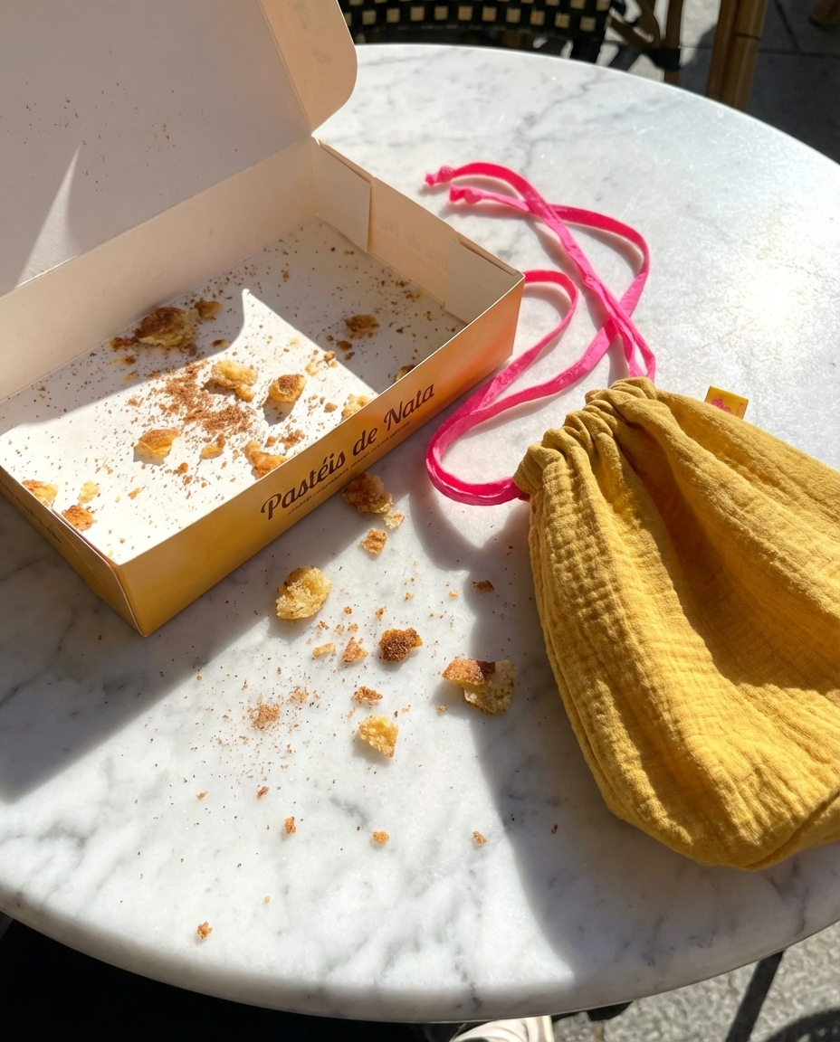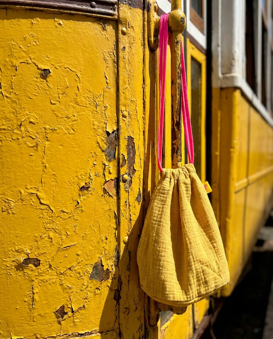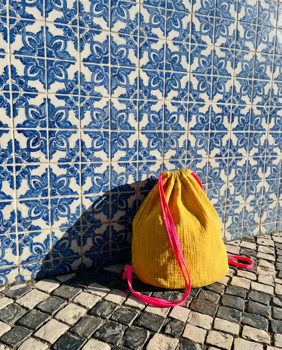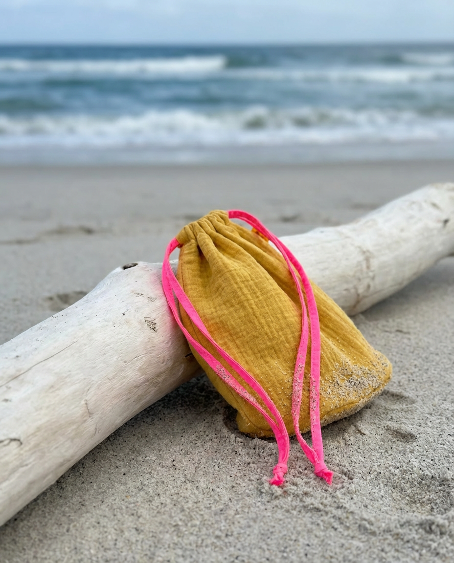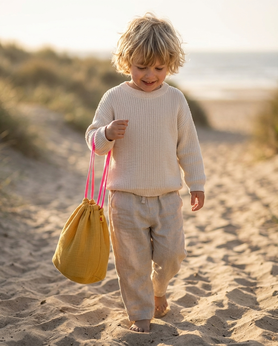 Una bolsa pequeña que guarda cosas grandes: tesoros de playa, meriendas improvisadas, juguetes mínimos, caracolas, patucos, llaves… lo que el día pida.