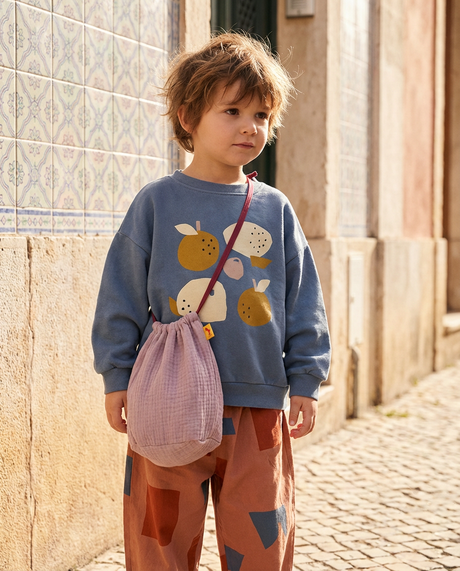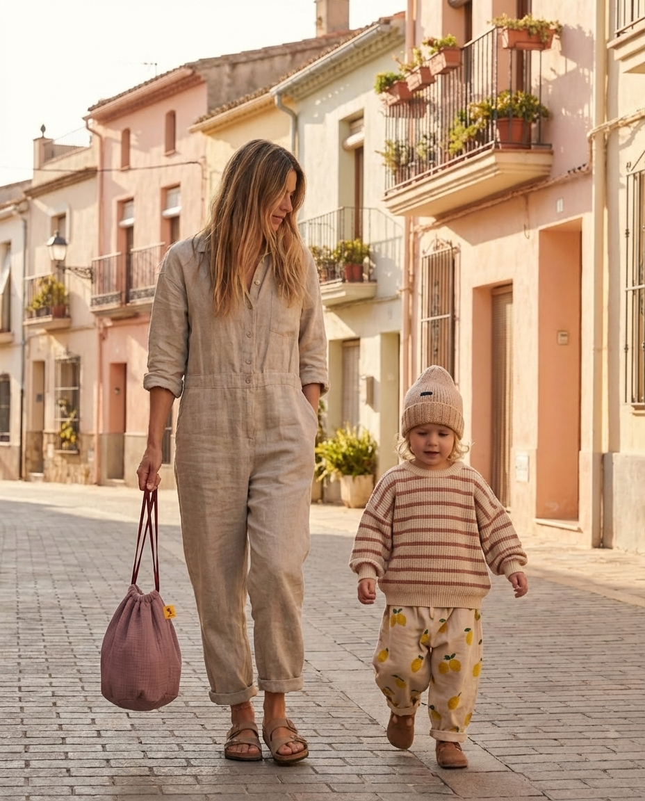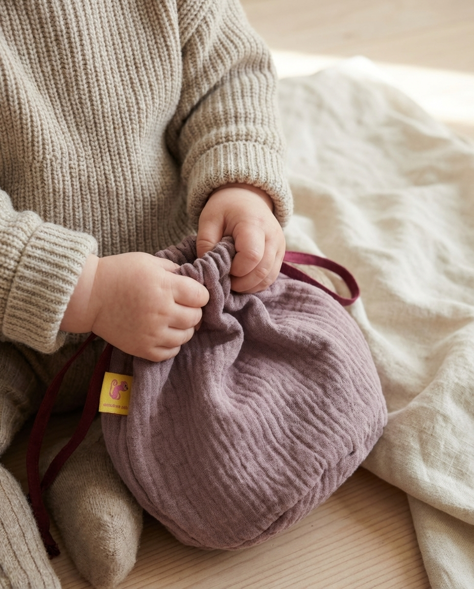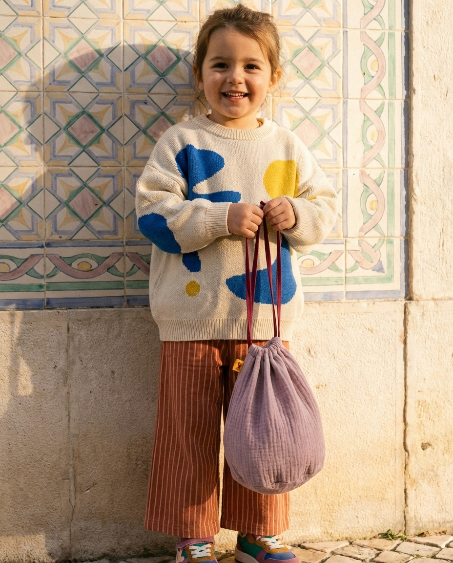 Una bolsa pequeña que guarda cosas grandes: tesoros de playa, meriendas improvisadas, juguetes mínimos, caracolas, patucos, llaves… lo que el día pida.
