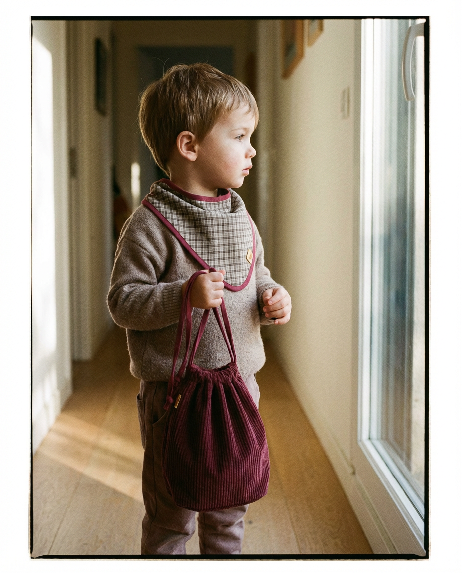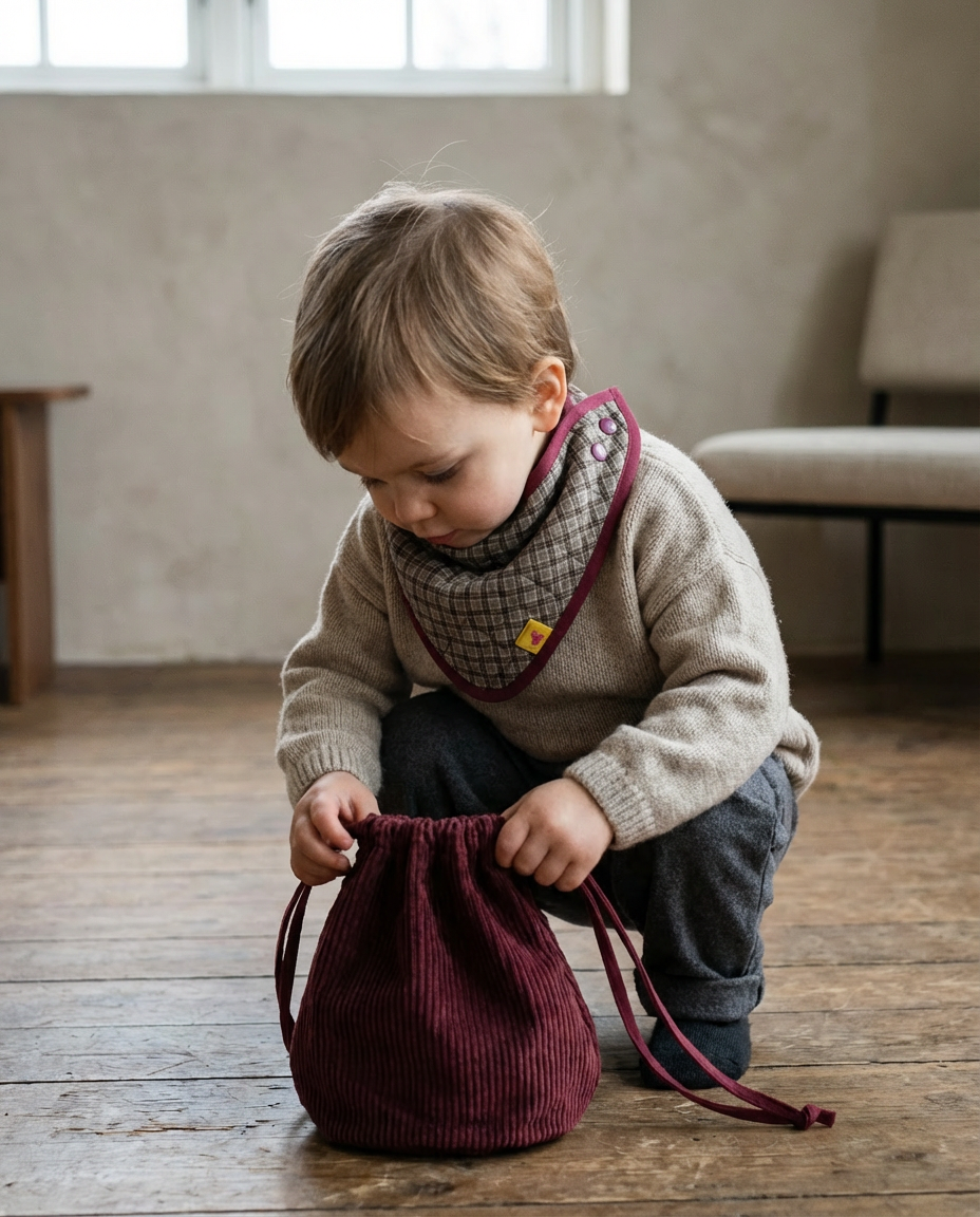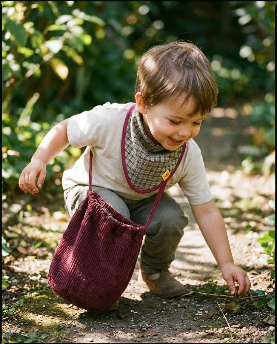 Hay colores que tienen el poder de detener el tiempo, y este granate es, sin duda, uno de ellos. Nuestra bolsita de pana no es solo un accesorio; es el lugar donde guardarán su primera muda, ese juguete inseparable o las castañas que recojan en un paseo por el parque.