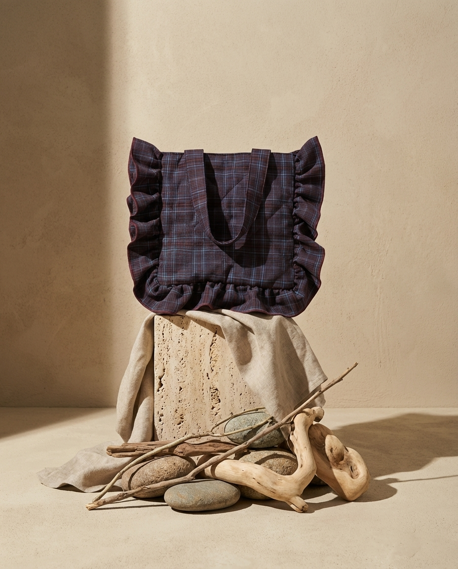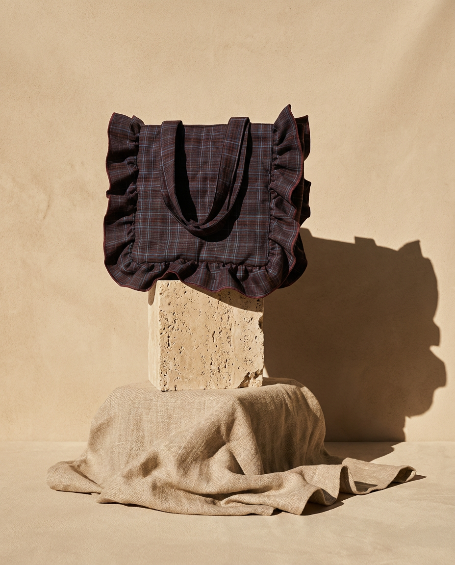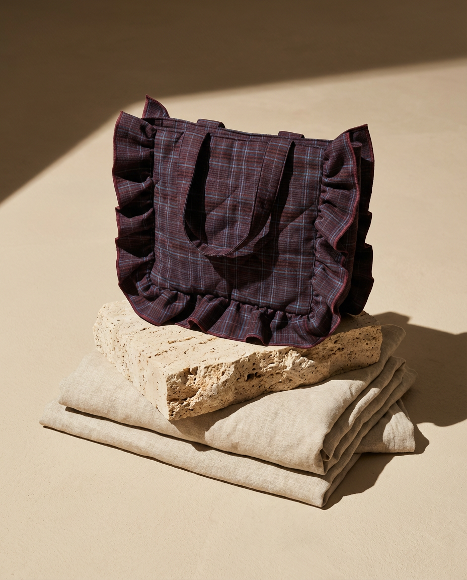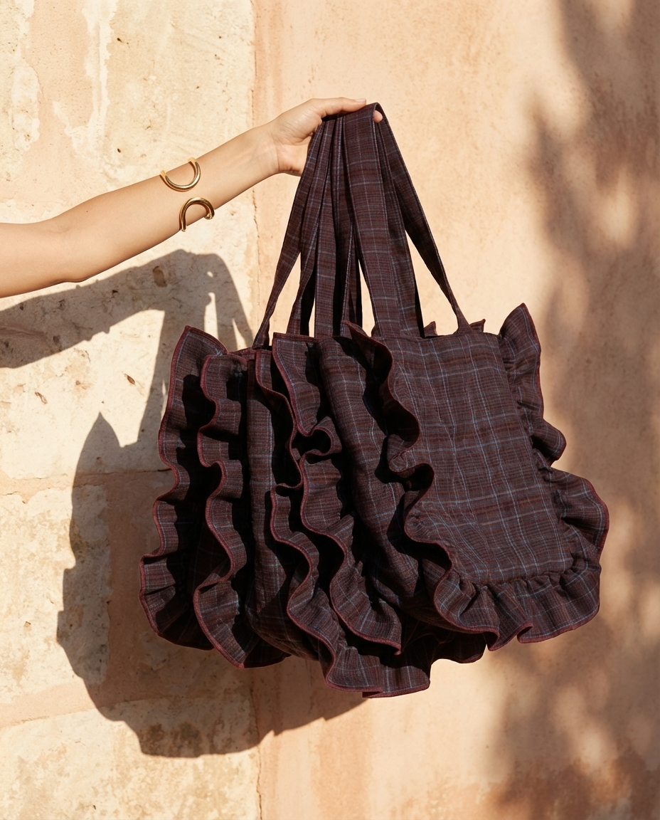 Su base de 30 × 30 x 13 cm es perfecta para llevar desde la merienda hasta ese “por si acaso” que siempre acaba salvando el día. Los volantes de 8 cm le dan el toque extra que lo convierte en statement, y el ribete burdeos lo hace todavía más especial.