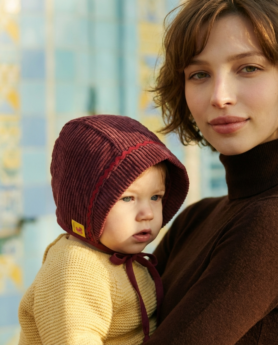 Confeccionado en una pana suave de canalé, cálida y ligera a la vez, este bonnet abraza la cabeza del bebé con una forma envolvente y estética, sin perder ese aire editorial que tanto nos gusta. El vivo ondulado en el borde añade un gesto delicado y juguetón, mientras que las tiras largas permiten ajustarlo con comodidad y seguridad.