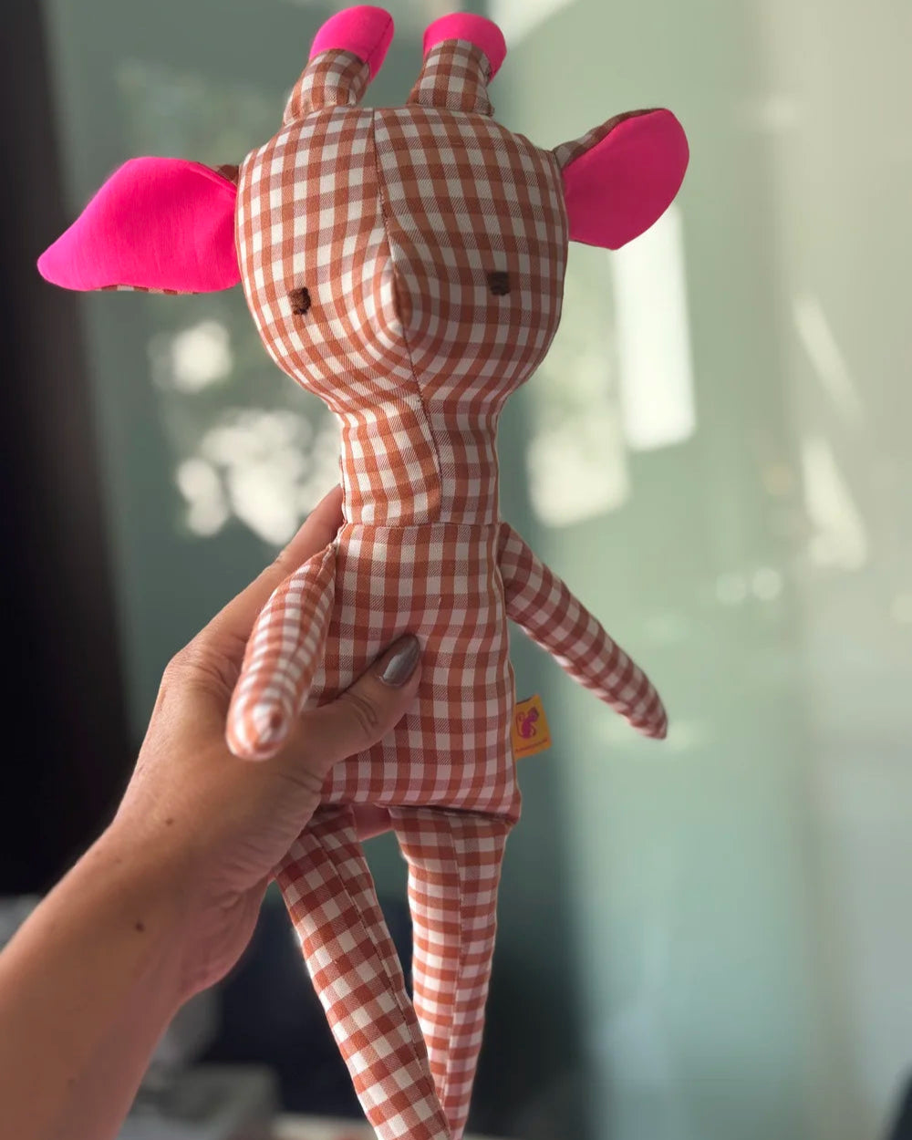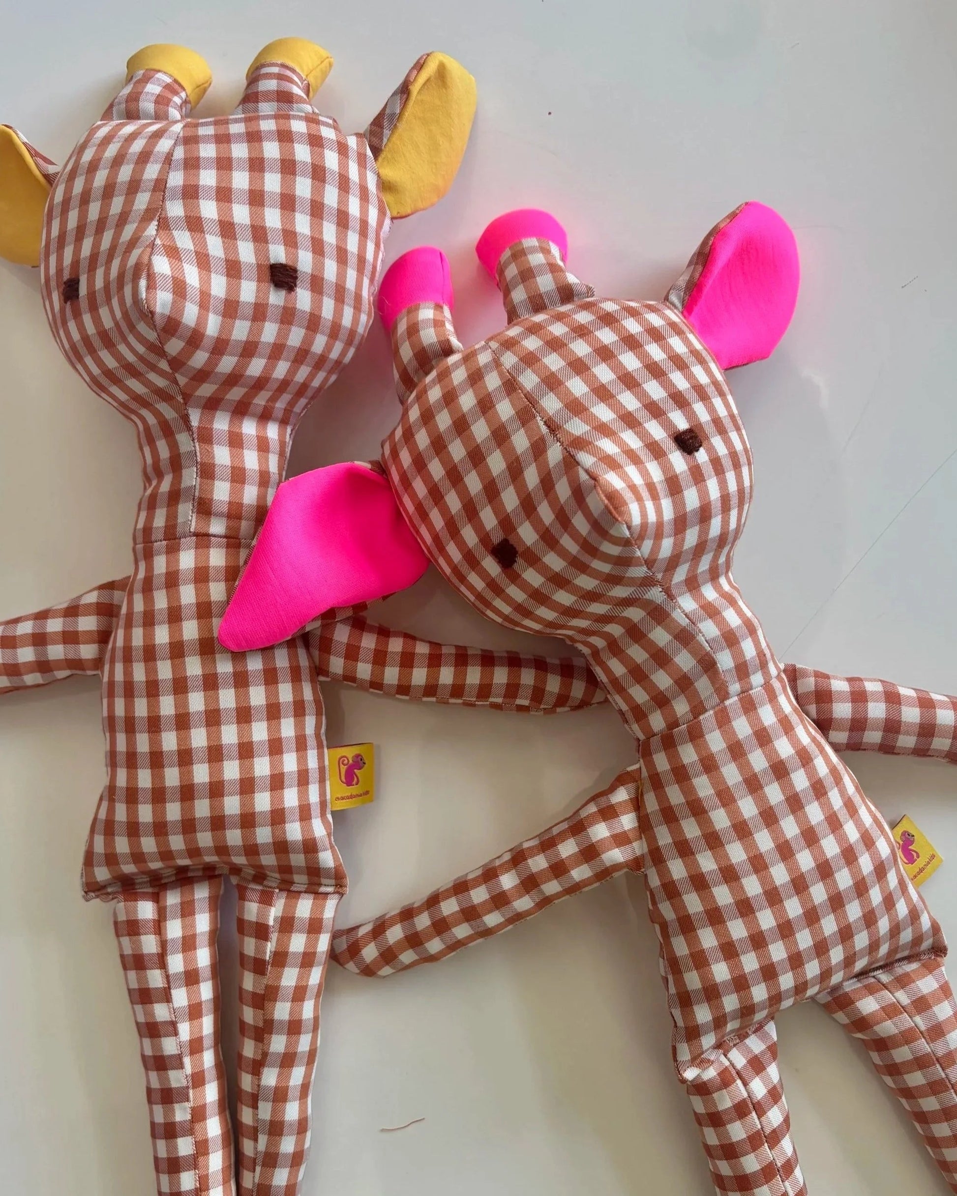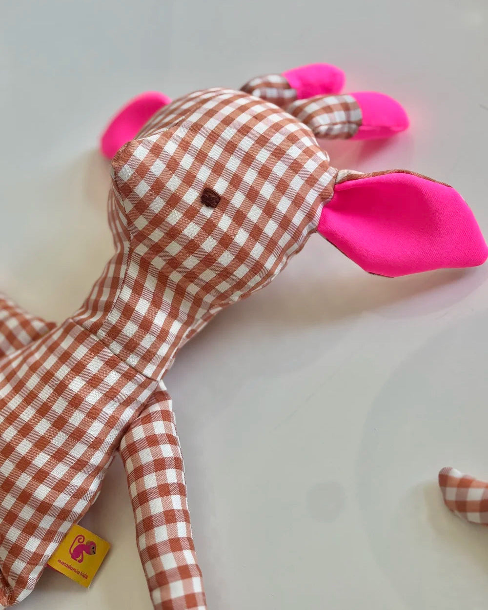 Hecha a mano con tela de cuadros vichy marrón y blanco, orejas de color vibrante (amarillo o fucsia) y un corazón lleno de historias por vivir.