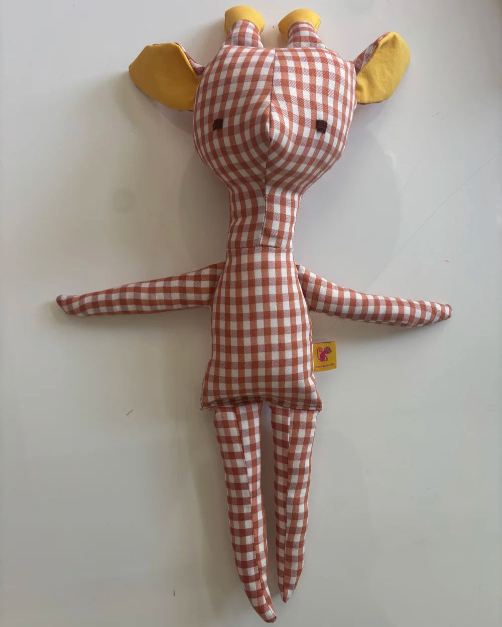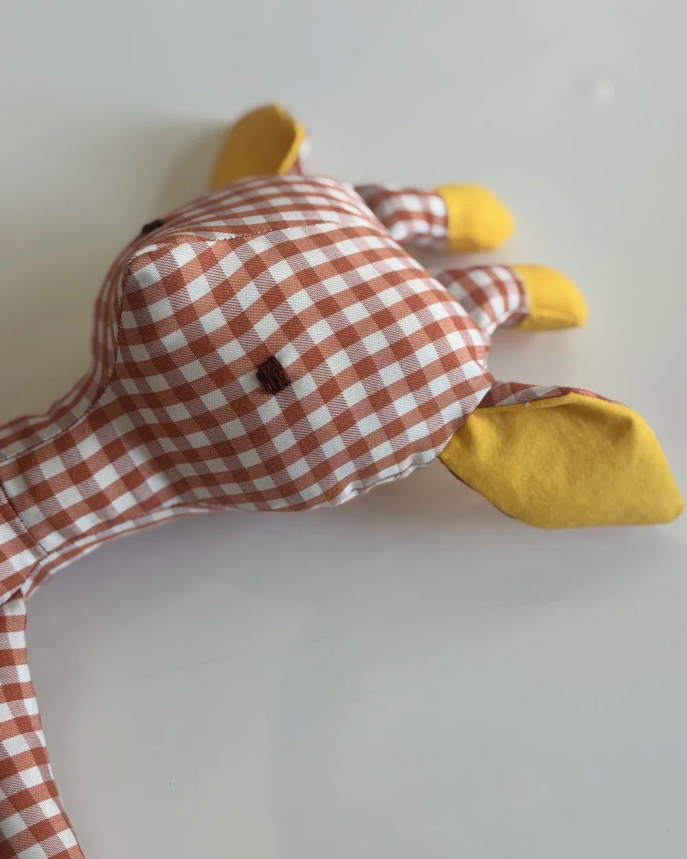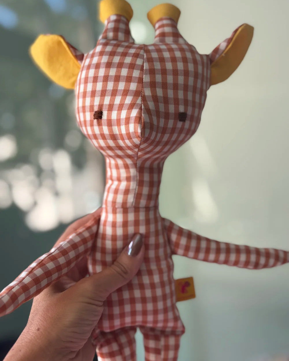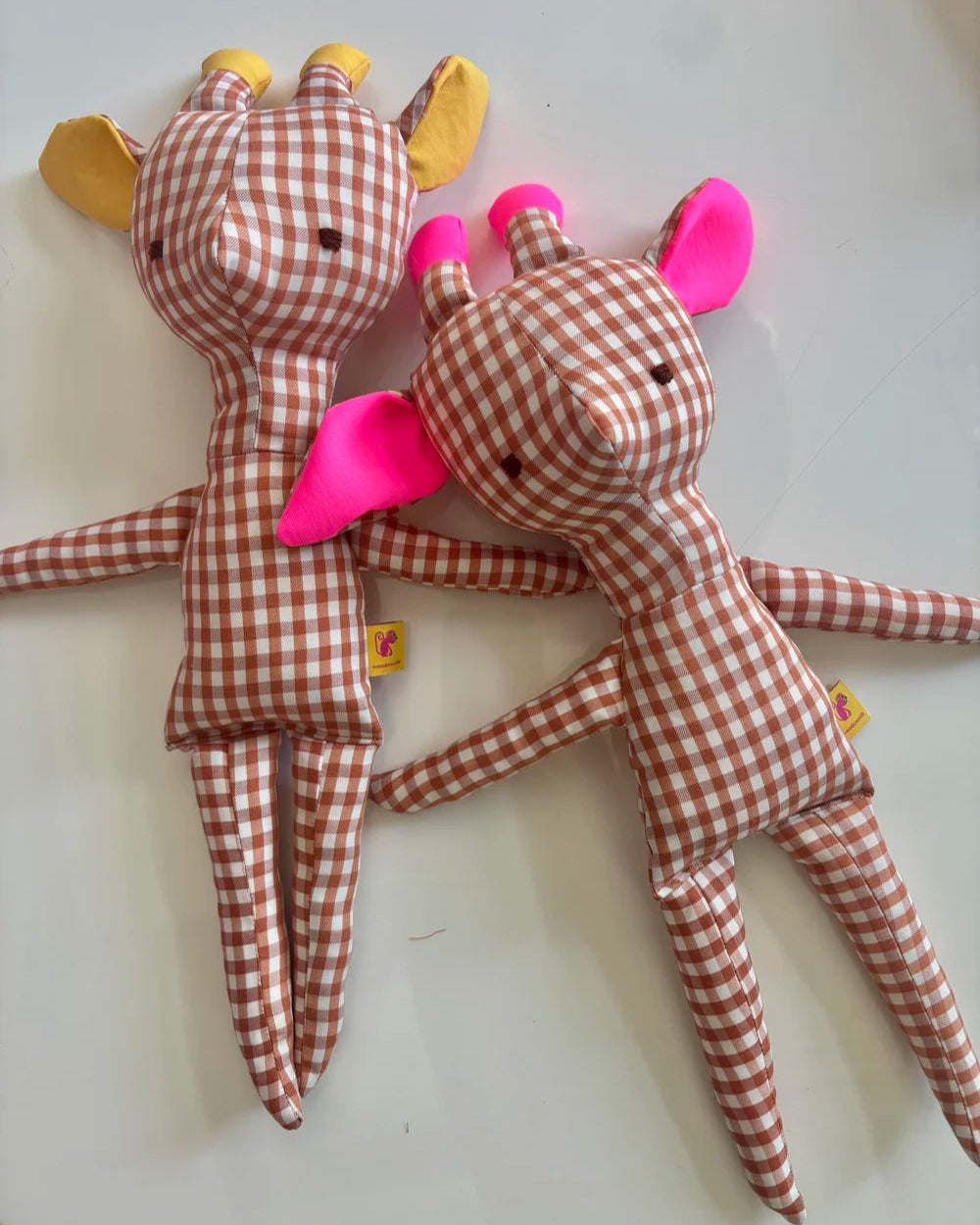 Hecha a mano con tela de cuadros vichy marrón y blanco, orejas de color vibrante (amarillo o fucsia) y un corazón lleno de historias por vivir.