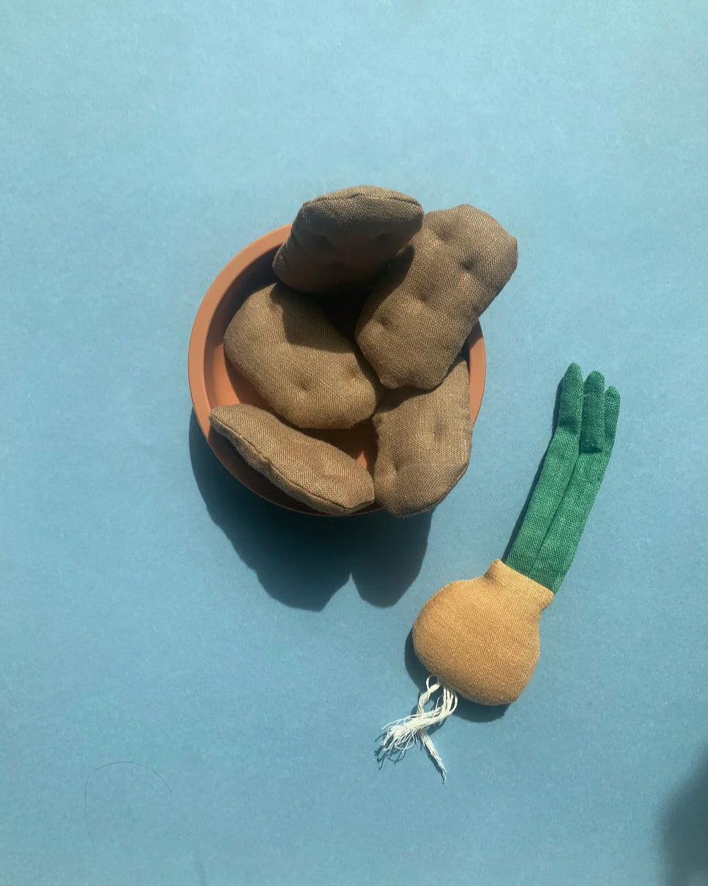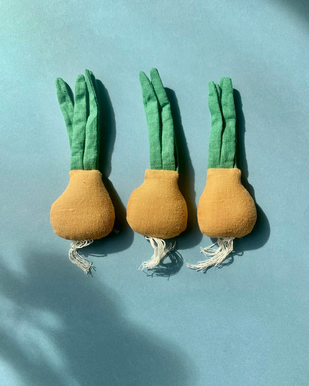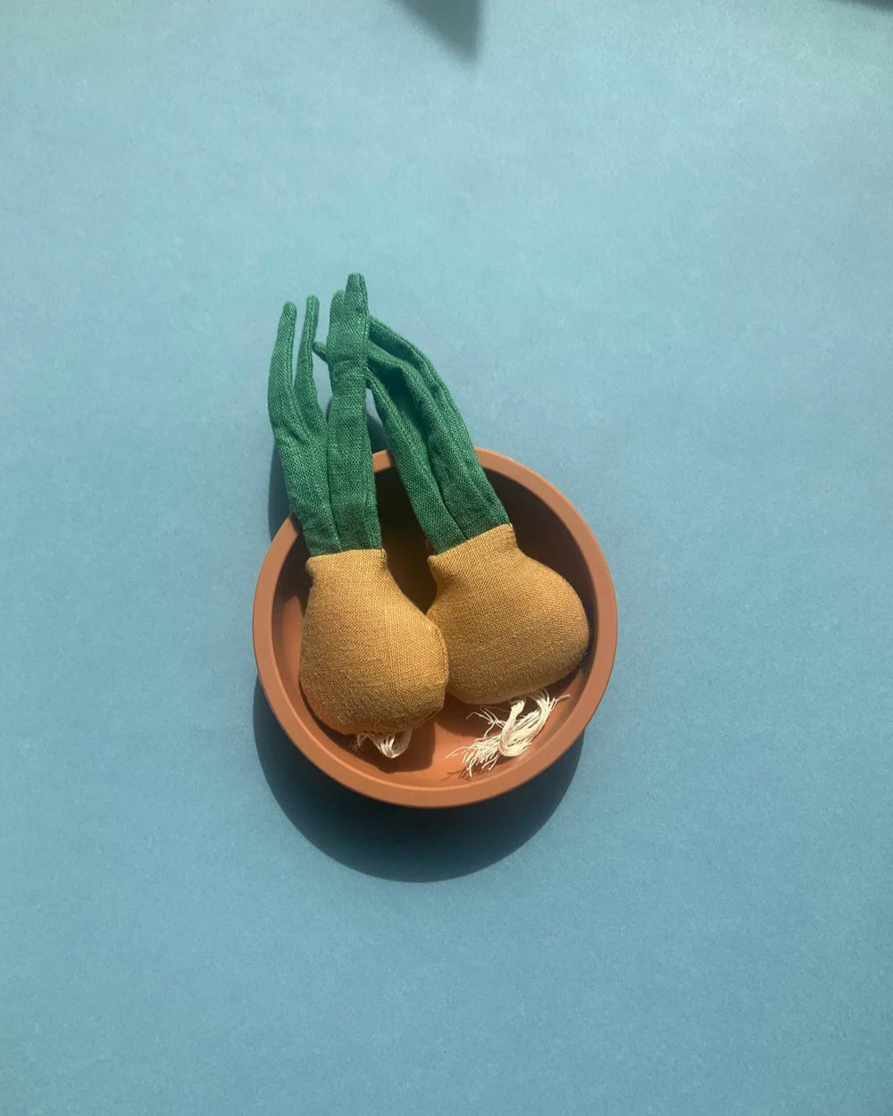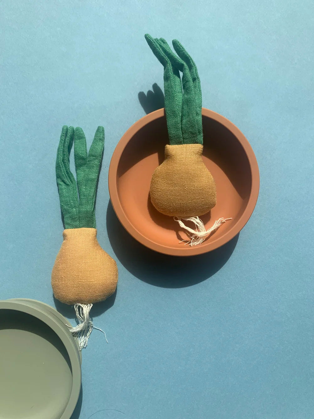 Con sus capas suaves y su tallo verde, esta cebolla artesanal de lino invita a jugar a cocinitas con un toque auténtico. Perfecta para inventar sopas mágicas, guisos de mentira y recetas con mucho humor. ¿Y si esta noche tu peque te sorprende con una exquisita tortilla de patatas?