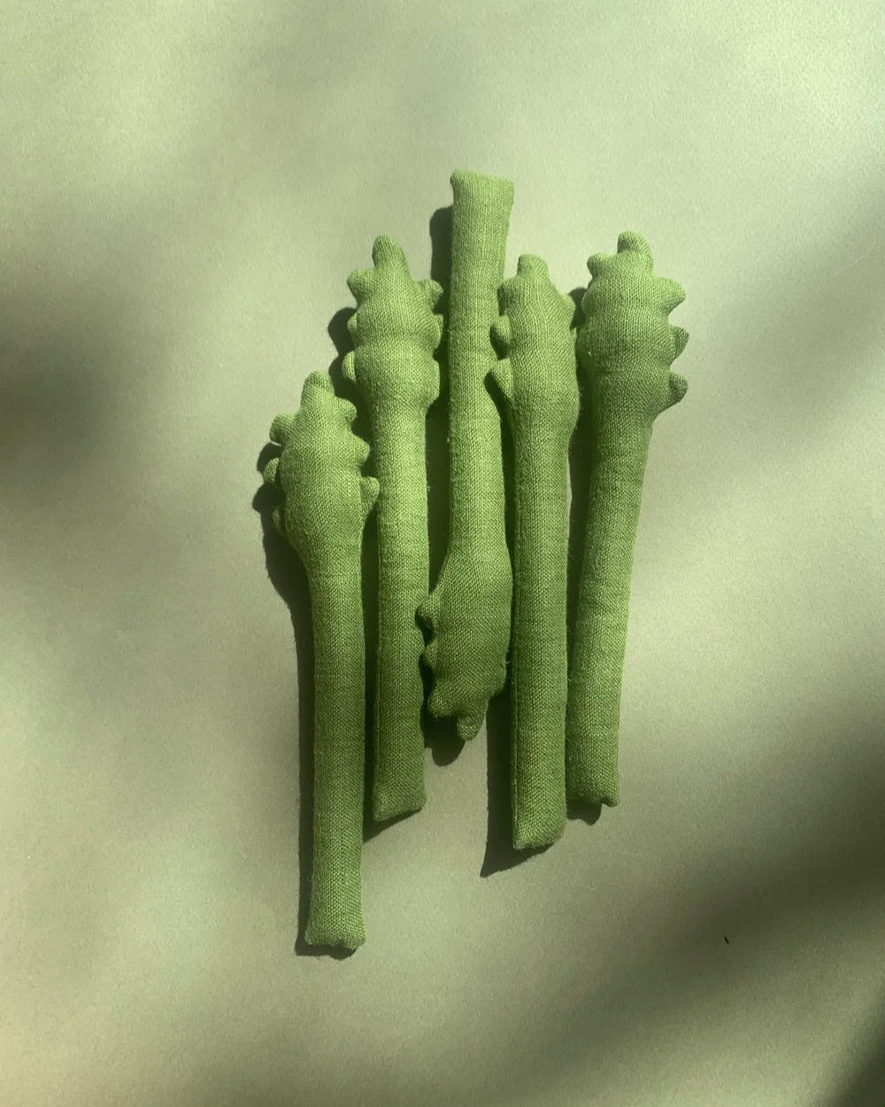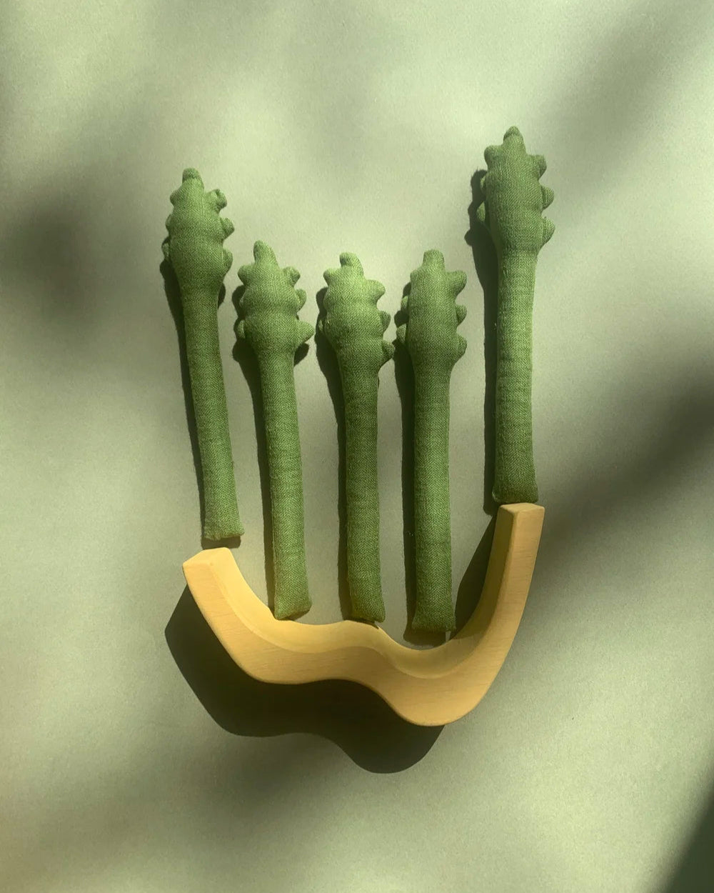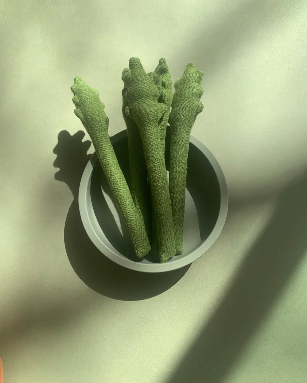 Verdes, alargados y un poco traviesos. Hechos a mano en lino natural, estos espárragos suaves invitan a jugar a las cocinitas, inventar recetas imposibles o decorar con un toque divertido y fresco.