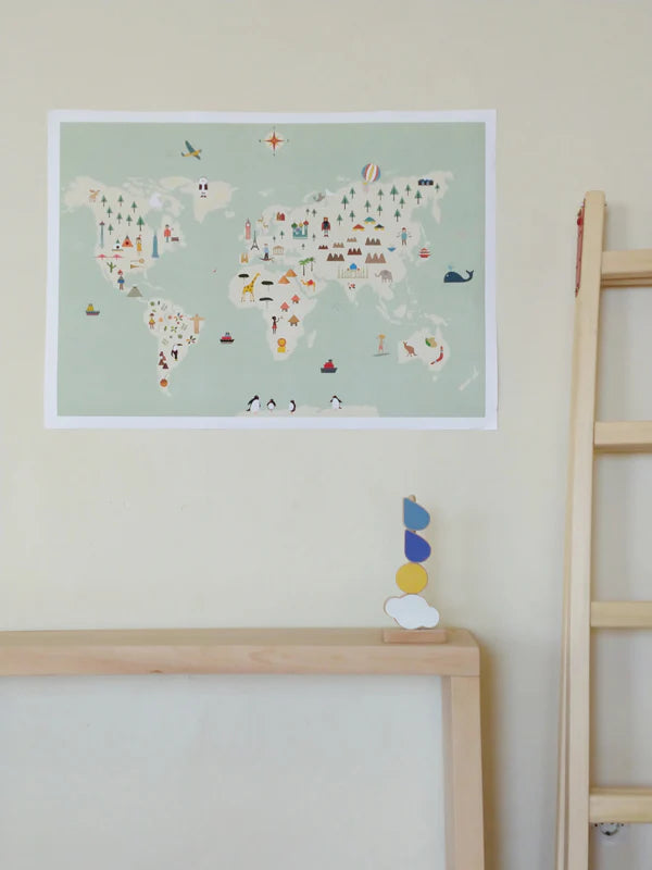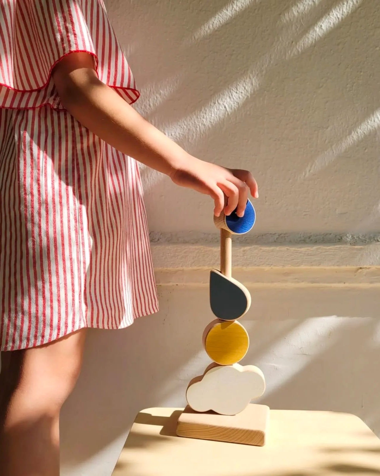 Sus piezas, suaves y ligeras, están pensadas para manos pequeñas que quieren construir su propio cielo: nube, sol y gotas de lluvia que cambian de lugar tantas veces como la imaginación lo permita.