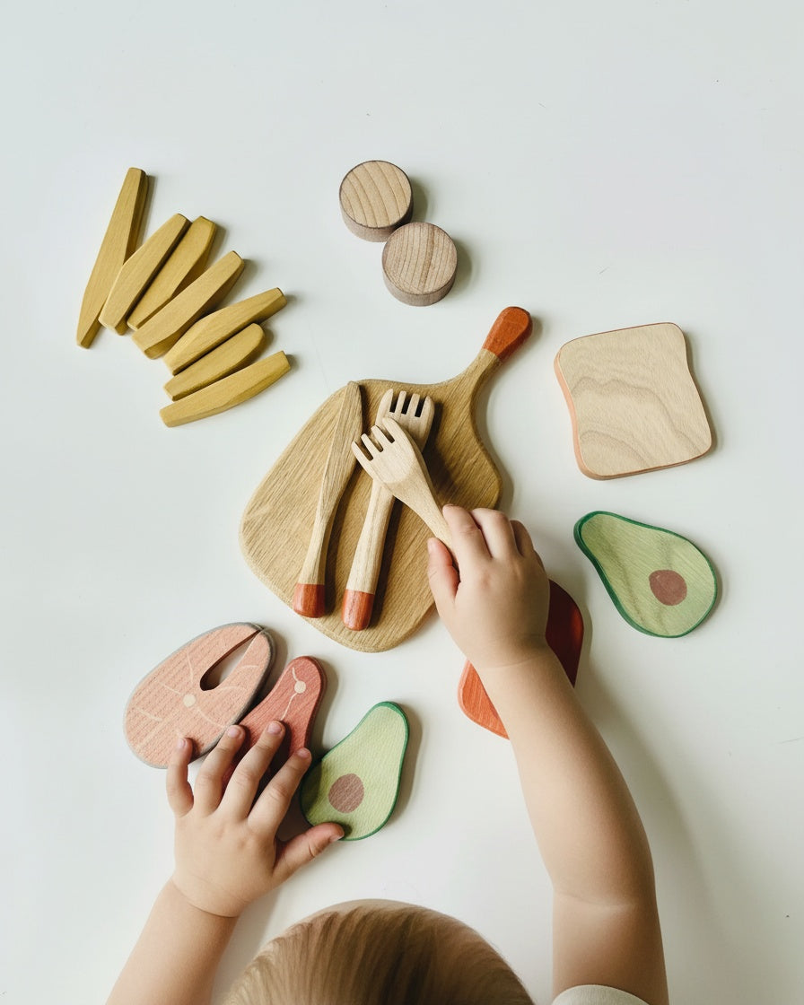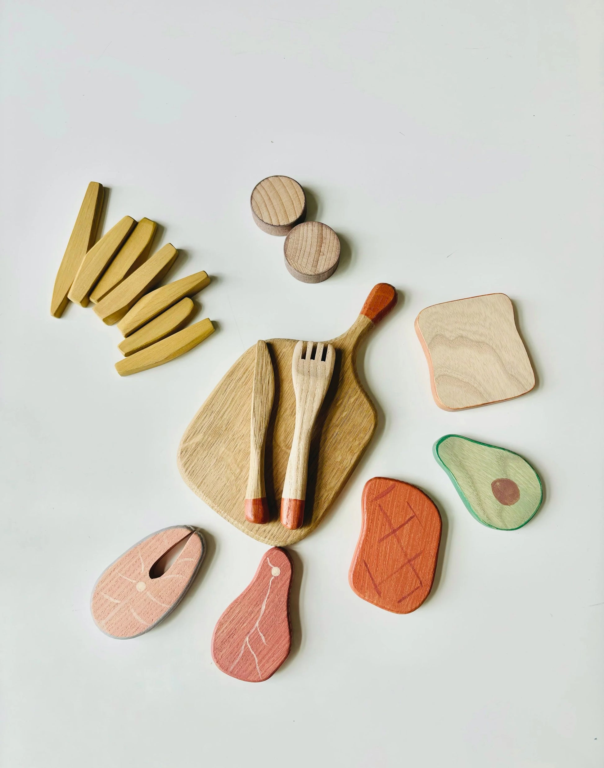 Incluye 11 piezas de madera: 7 patatas fritas, 1 tabla de cortar, 1 cuchillo y 1 tenedor, 2 lonchas de berenjena, 1 aguacate, 1 tostada, filete de salmón, 1 solomillo de ternera y 1 mediana de cordero