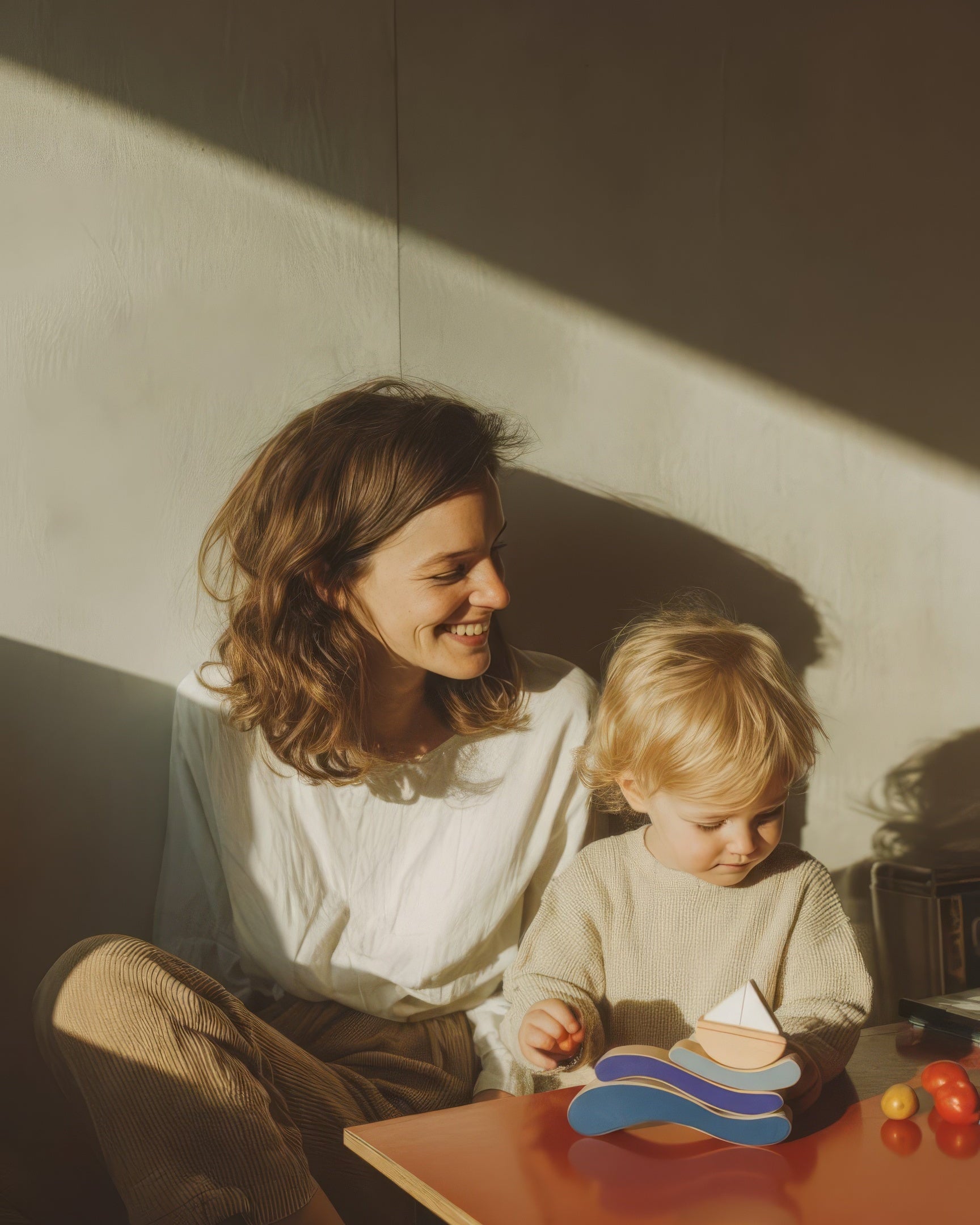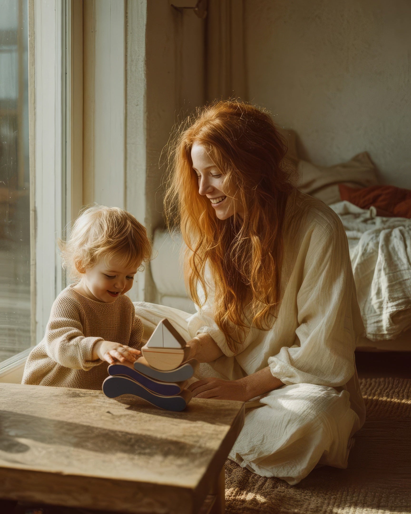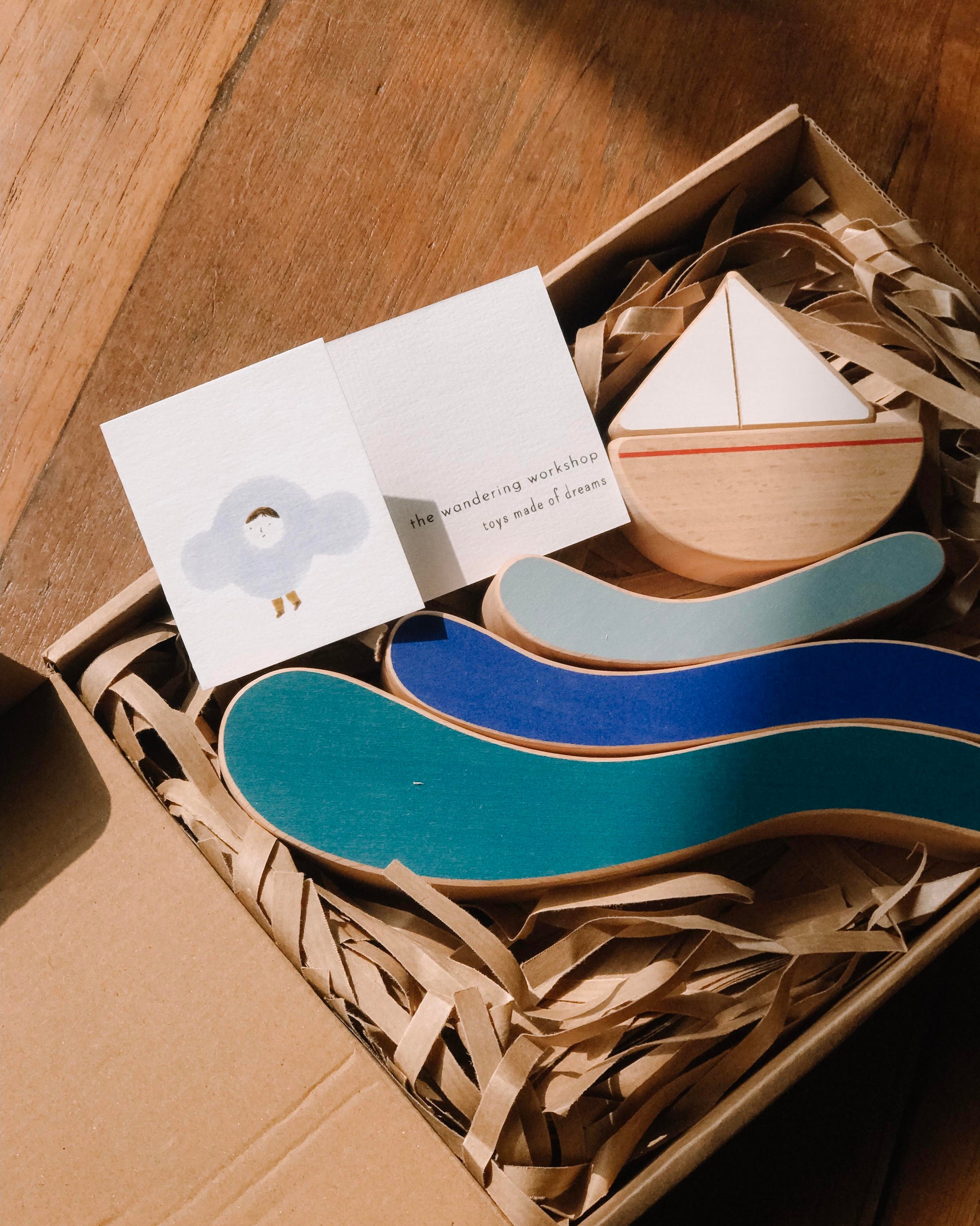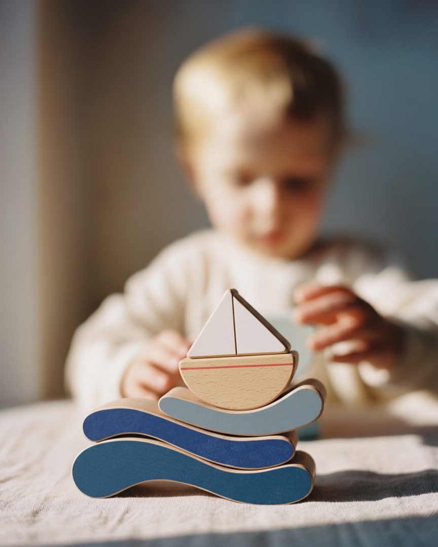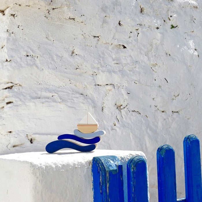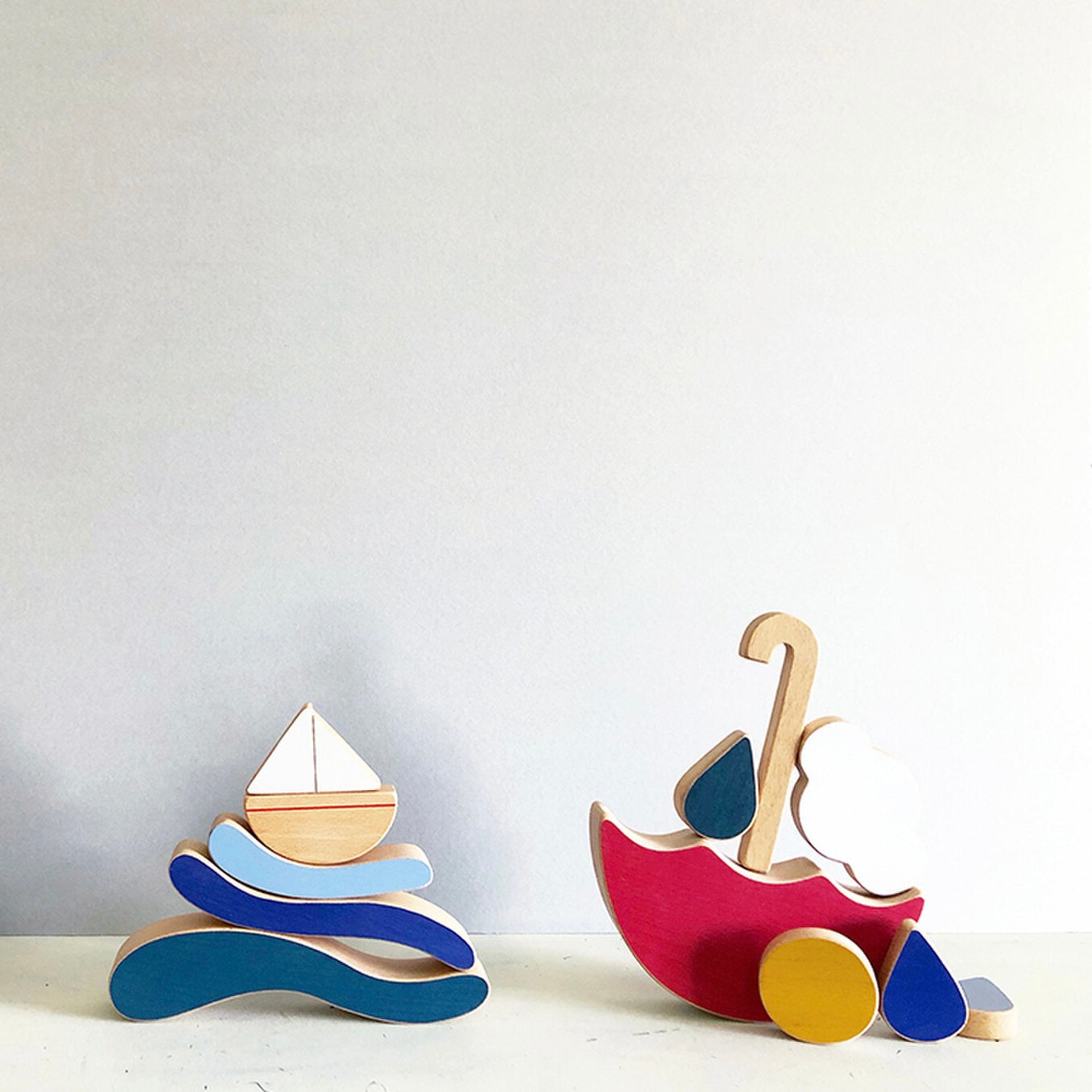 Este juguete de madera apilable está formado por 5 piezas suaves y redondeadas, que invitan a construir, imaginar y crear historias de mar y viento.