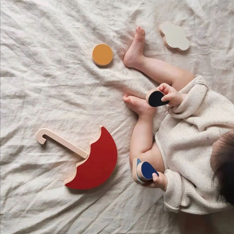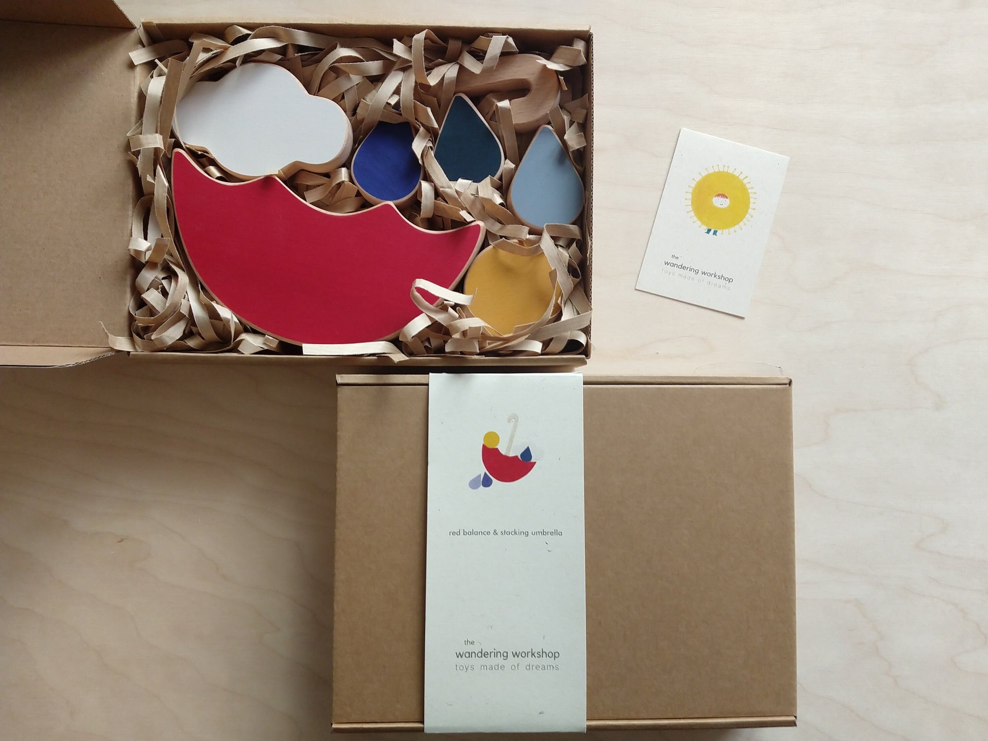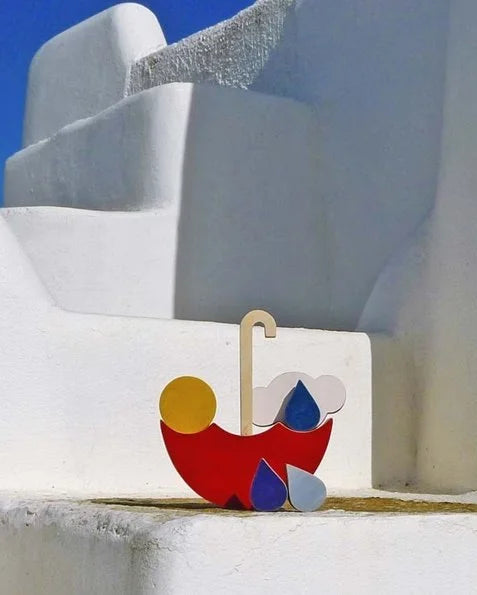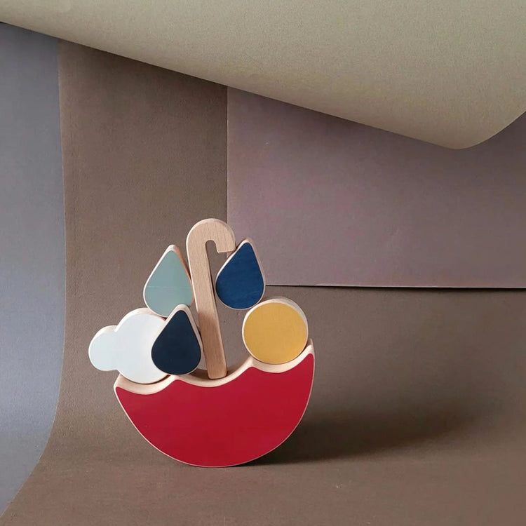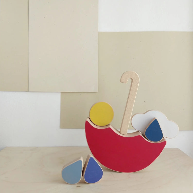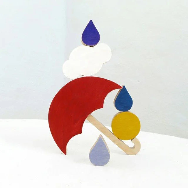 Este juguete de madera de The Wandering Workshop convierte el clima en juego: apila las gotas, busca el equilibrio y descubre cuántas historias pueden nacer bajo un paraguas.