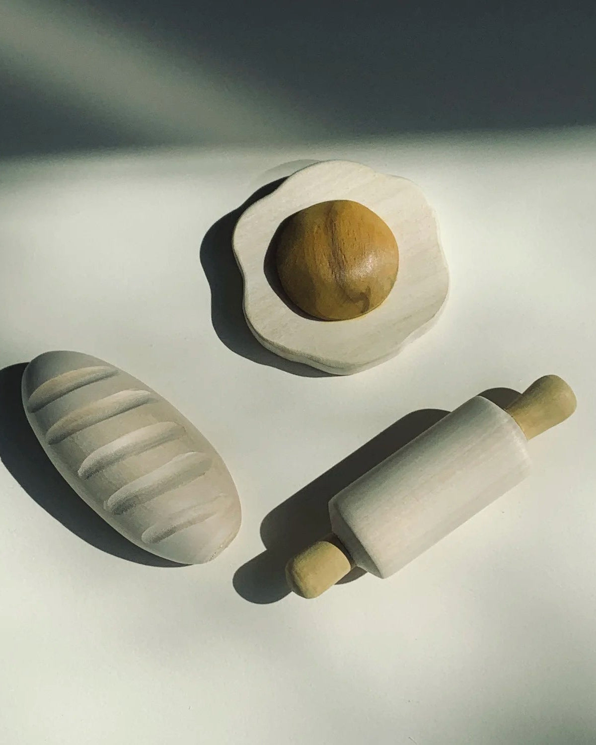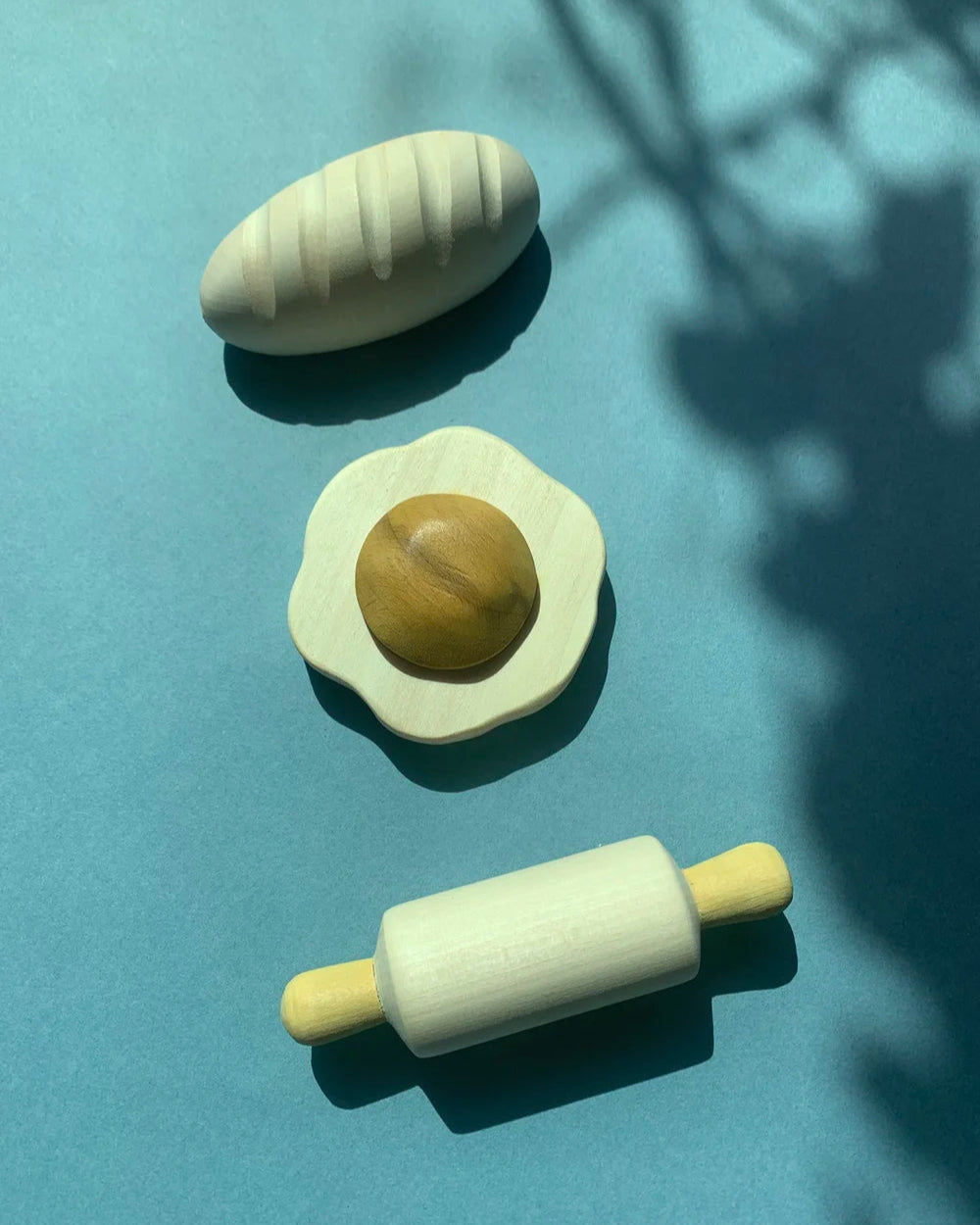 Incluye un huevo frito, un pan artesano y un rodillo, todos fabricados y pintados a mano con pintura Biofa libre de tóxicos. Cada pieza está cortada, lijada y terminada para que sea segura y agradable al tacto.