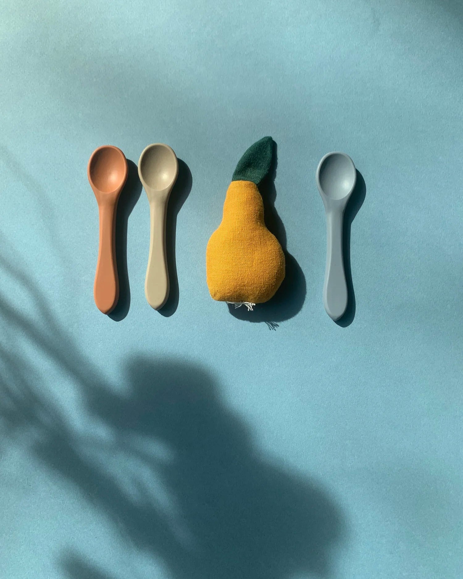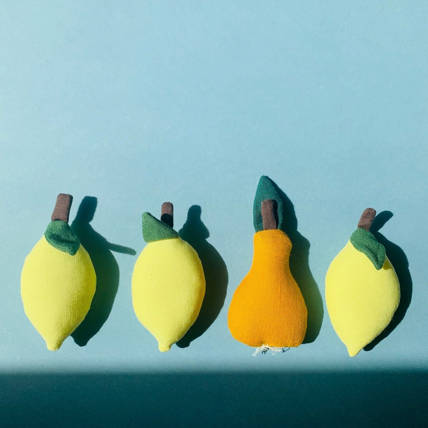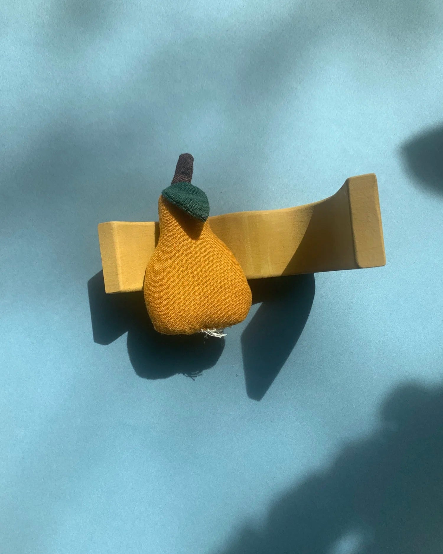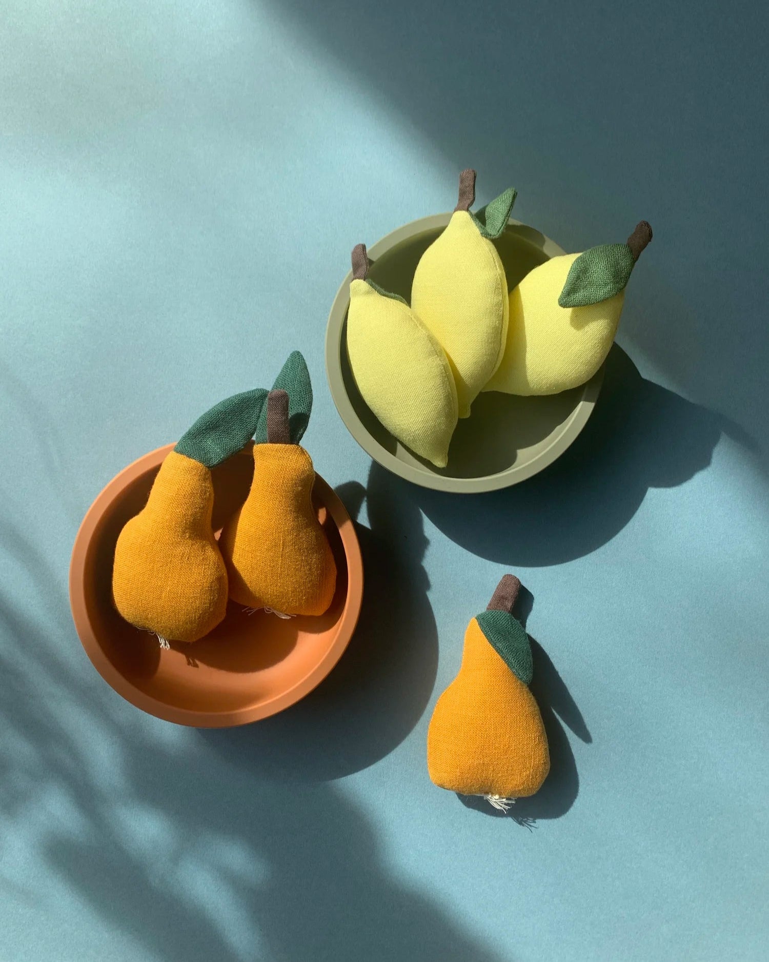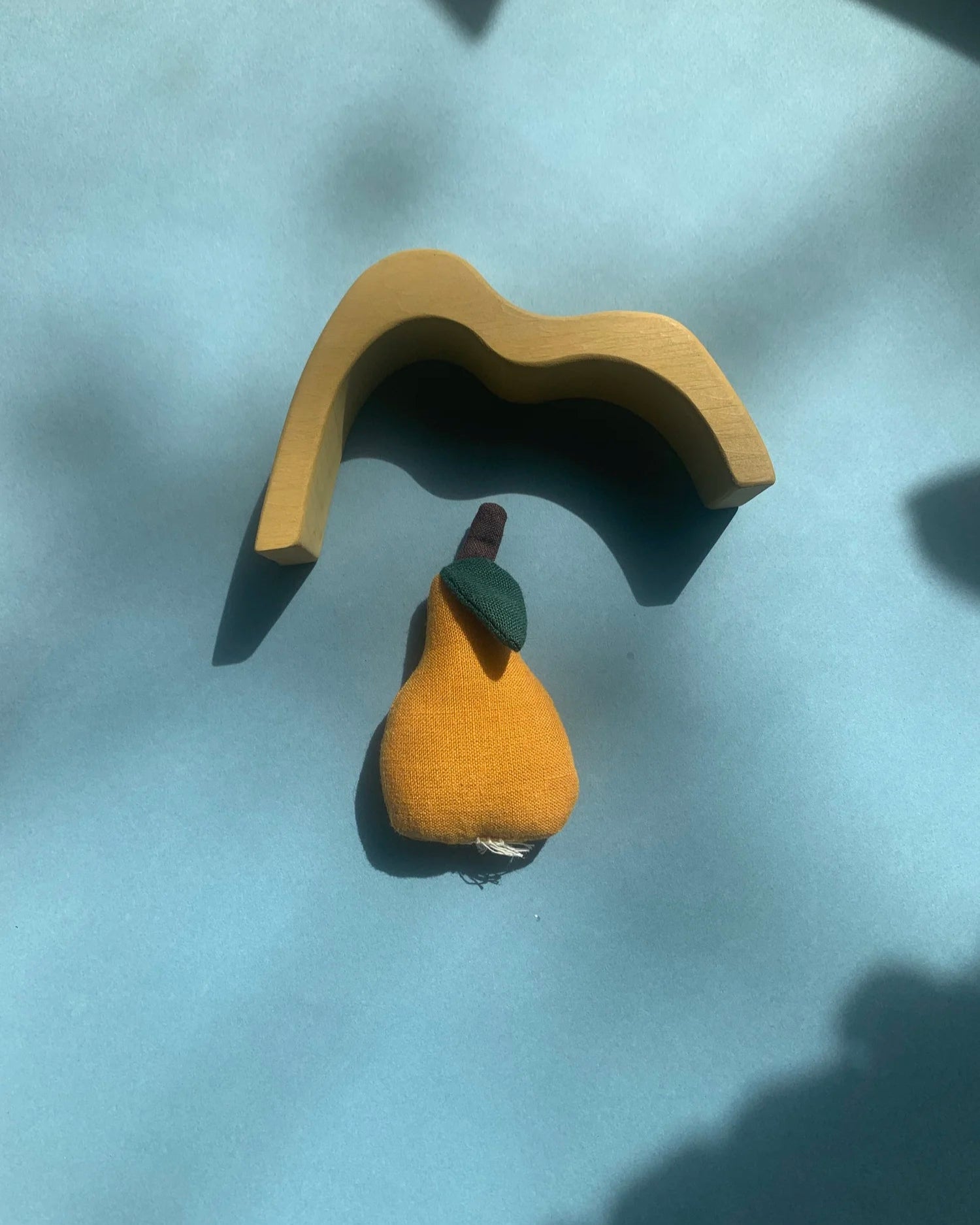 Hecha a mano con lino y rellena de fibra hueca, es ligera, suave y perfecta para las manos pequeñas que quieren jugar a ser cocineros, tenderos o recolectores.
