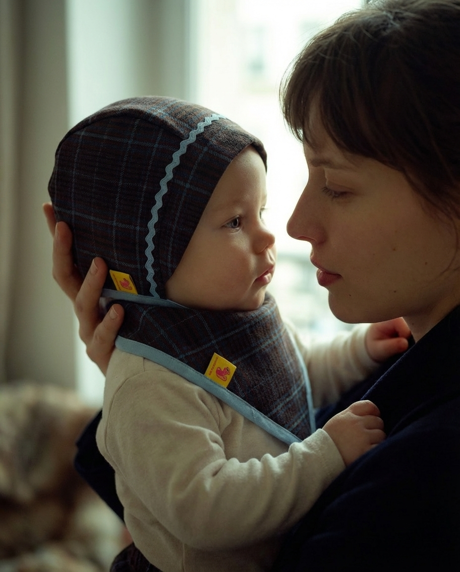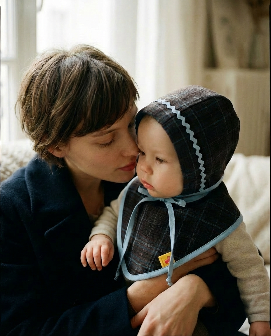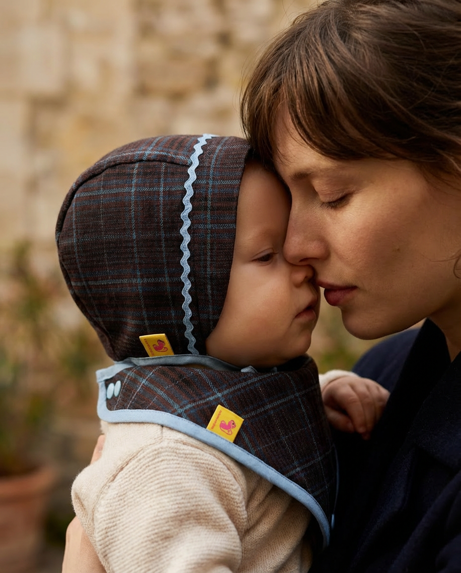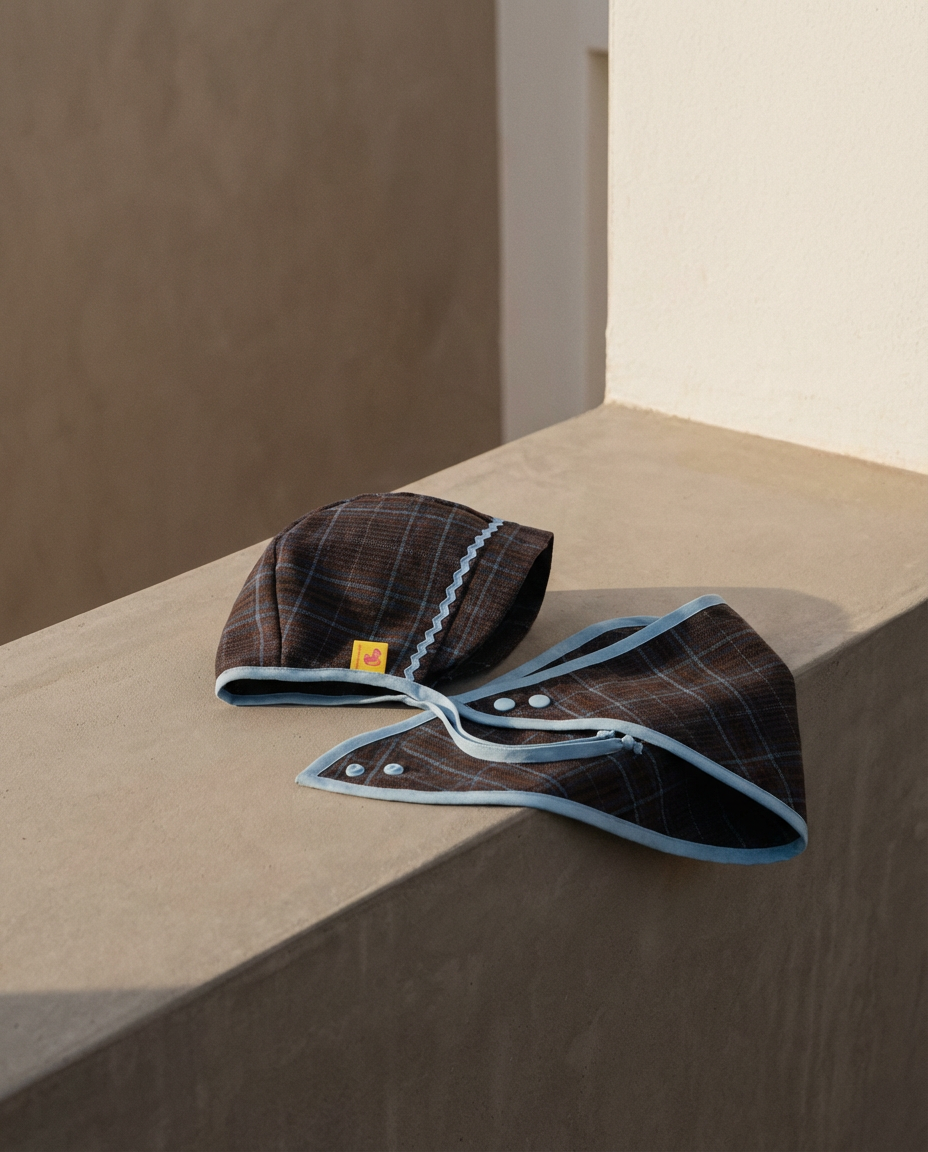 Tejido de cuadros, acabados delicados y una paleta serena que funciona igual en interior que al aire libre. El bonnet protege sin apretar, envolviendo con calma. La bandana completa el conjunto con un gesto práctico y bonito, ajustable al cuello del bebé.