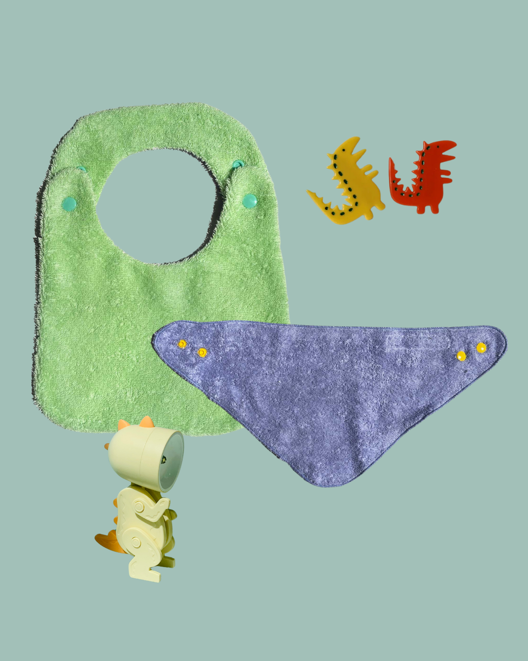 Un babero verde para los bocados épicos, una bandana lila para las babitas viajeras, dos clips-dino que son medallas de valentía y una linternita dino espanta-monstruos para cuando la merienda se alarga hasta la cueva del pasillo. Aventura controlada, luz encendida.