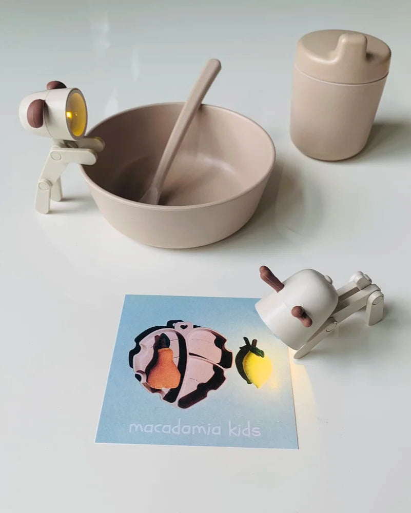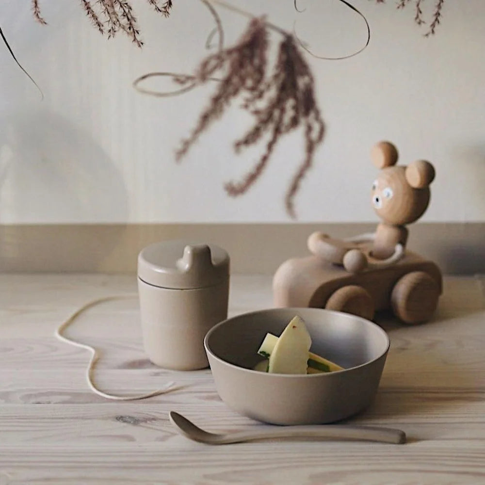 Incluye un cuenco, un vasito con tapa extraíble y una cuchara pensada para las primeras papillas y las manos torpes que aprenden.
